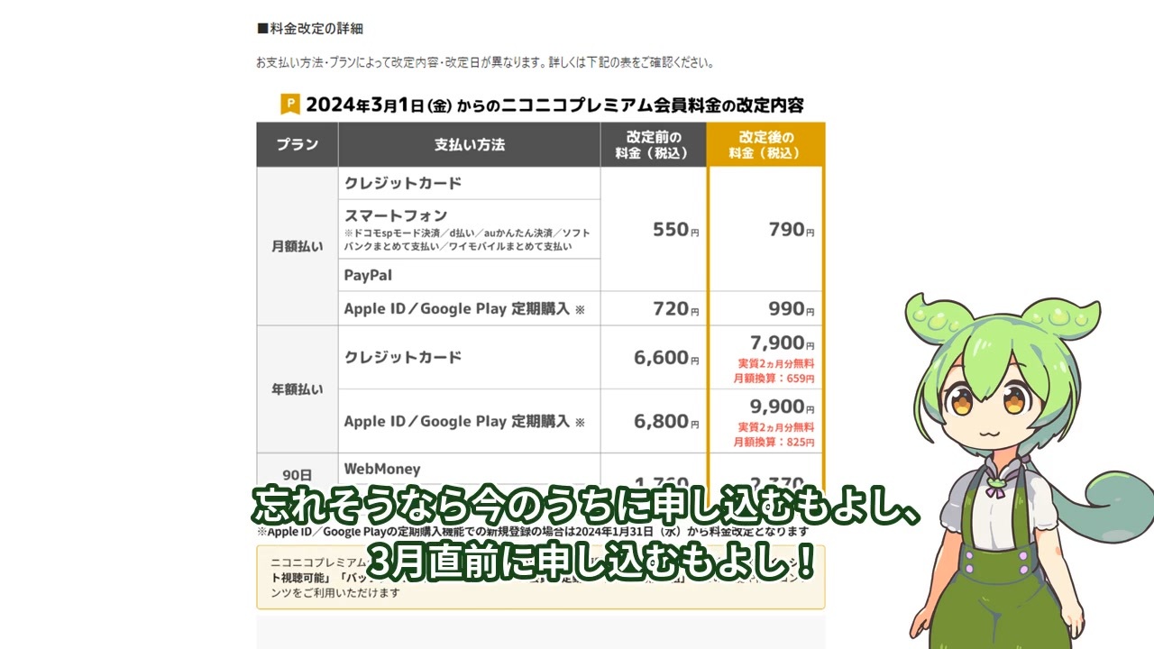 キャンペーン詳細は以下から!<br><a href="https://blog.nicovideo.jp/niconews/205143.html" target="_blank" rel="noopener nofollow">https://blog.nicovideo.jp/niconews/205143.html</a><br><br>※ 内容を詳細な手順を追記したバージョンに差し替えました!<br><br>ニコニコWebから年額払いに変更したら以下のフォームで申請!<br><a href="https://secure.nicovideo.jp/form/entry/apcp_205143?ref=cp_info" target="_blank" rel="noopener nofollow">https://secure.nicovideo.jp/form/entry/apcp_205143?ref=cp_info</a><br><br>作ってって話だったので作りました。<br><a href="https://twitter.com/sigekun/status/1732279611525111964" target="_blank" rel="noopener nofollow">https://twitter.com/sigekun/status/1732279611525111964</a><br><a href="https://x.com/t_zunko/status/1732295010228515239?s=20" target="_blank" rel="noopener nofollow">https://x.com/t_zunko/status/1732295010228515239?s=20</a><br><br>声:VOICEVOX ずんだもん<br><br><a target="_blank" href="https://qa.nicovideo.jp/faq/show/19424?site_domain=default" style="font-size: 13px;color: #657586; text-decoration: underline; line-height: 1.4">この動画は投稿者によって修正されました</a>