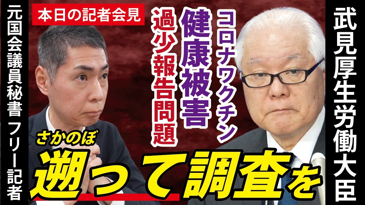 令和5年12月8日 厚生労働大臣記者会見<br><br>藤江の質問シーンは9:11<br><br>―――――――――――――――――――――――――――――――<br><br>❑4月10日発売予定「世界を欺いた〇〇〇〇〇〇〇」(宝島社新書)<br><a href="https://amzn.to/3ymDfgr" target="_blank" rel="noopener nofollow">https://amzn.to/3ymDfgr</a><br>鳥集徹(著) 闇のダディ(著) 藤江成光(著)←私<br><br>―――――――――――――――――――――――――――――――<br><br>❑新しい動画サイト「真の日本人増加計画」始めました!<br><a href="https://nicochannel.jp/fujie/" target="_blank" rel="noopener nofollow">https://nicochannel.jp/fujie/</a><br>(ニコニコチャンネル+)<br><br><br>❏藤江の活動を支援していただける方向け<br>【藤江支援口座】のご案内<br>住信SBIネット銀行 ミカン支店(店番号103)<br>口座番号 3107694<br>口座名義 フジエ マサミツ<br><br>――――――――――――――――――――――――――――――<br><br>日本の人口増加を目指す男、藤江です!【メインチャンネル】<br><a href="https://www.youtube.com/c/JINKOUZOUKA/" target="_blank" rel="noopener nofollow">https://www.youtube.com/c/JINKOUZOUKA/</a><br><br>地域と日本の存続のためニ!【藤江2ndチャンネル】<br><a href="https://www.youtube.com/channel/UCfBh4rv5UT7D-qR6KsoZrsA" target="_blank" rel="noopener nofollow">https://www.youtube.com/channel/UCfBh4rv5UT7D-qR6KsoZrsA</a><br><br>今こそ!三千年の底力【藤江3rdチャンネル】<br><a href="https://www.youtube.com/channel/UC5Yrsm8-X8nZj4uKgvE7CBw" target="_blank" rel="noopener nofollow">https://www.youtube.com/channel/UC5Yrsm8-X8nZj4uKgvE7CBw</a><br><br>四海兄弟【藤江4thチャンネル】<br><a href="https://www.youtube.com/channel/UCiyJNO57quj80Ysy7nOABvA" target="_blank" rel="noopener nofollow">https://www.youtube.com/channel/UCiyJNO57quj80Ysy7nOABvA</a><br><br>五穀豊穣【藤江5thチャンネル】<br><a href="https://www.youtube.com/channel/UCptMJCoKYghfew5tDzoEqHQ" target="_blank" rel="noopener nofollow">https://www.youtube.com/channel/UCptMJCoKYghfew5tDzoEqHQ</a><br><br>六根清浄【藤江6thチャンネル】<br><a href="https://www.youtube.com/@FUJIE6th" target="_blank" rel="noopener nofollow">https://www.youtube.com/@FUJIE6th</a><br><br>藤江のTwitter<br><a href="https://twitter.com/JINKOUZOUKA_jp" target="_blank" rel="noopener nofollow">https://twitter.com/JINKOUZOUKA_jp</a><br><br>藤江のニコニコ動画<br><a href="https://www.nicovideo.jp/user/5457748" target="_blank" rel="noopener nofollow">https://www.nicovideo.jp/user/5457748</a>