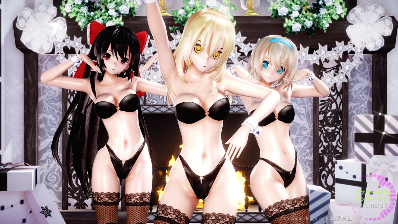3人に踊ってもらいました。<br>現在、作成リクエストは受け付けていません。<br><br><br>【楽曲】:「アフターナイト ワンダーランド」:ryt 様 <a href="https://www.nicovideo.jp/watch/sm15793598" class="watch">sm15793598</a><br><br>【トレス元】:ぴのぴ様 <a href="https://www.nicovideo.jp/watch/sm20965409" class="watch">sm20965409</a><br><br>【モーション・カメラ】:gagasin 様 <a href="https://www.nicovideo.jp/watch/sm21607866" class="watch">sm21607866</a><br><br><br>■スカイドーム<br>都市夜景ゴールドナイトNN6:怪獣対若大将P 様 <a href="https://seiga.nicovideo.jp/seiga/im5559486" target="_blank" rel="noopener">im5559486</a><br>まばゆい月光TD8:怪獣対若大将P 様 <a href="https://seiga.nicovideo.jp/seiga/im6013794" target="_blank" rel="noopener">im6013794</a><br><br>■ステージ<br>Stage36:那智様<br>クリスマスツリー1.05:おおい様 <a href="https://seiga.nicovideo.jp/seiga/im11094711" target="_blank" rel="noopener">im11094711</a><br>kotami stage074:kotami cafe様<br>バレンタイン部屋:~白~様 <a href="https://seiga.nicovideo.jp/seiga/im6489221" target="_blank" rel="noopener">im6489221</a><br>クリスマス部屋:~白~様 <a href="https://seiga.nicovideo.jp/seiga/im6345268" target="_blank" rel="noopener">im6345268</a><br><br>■モデル<br>霊夢、魔理沙、アリス:にがもん様、しえら様<br>・衣装:アールビット様<br><br>■エフェクト<br>Ray-mmd-1.5.2:Rui様<br>初心者マテリアル:さらしな様<br>肌マテリアル:MARUSU様<br>AutoLuminous4:そぼろ様<br>水面エフェクト:ビームマンP様<br>空中に漂う埃:化身バレッタ様<br>ikBokeh_v020a:ikeno様<br><br><br>MikuMikuDance:樋口優様<br>MMEffect :舞力介入P様<br>PMDE、PmxE:極北P様<br>AviUtl :KENくん様<br>Ut Video Codec suite:ゆーむP様<br>上海アリス幻楽団・東方project(ZUN様)<br><br>ゲルド様、ねむ様、ゆうろえーす様x22、cz500c様x2、rikikun様、アルマク 鮎様、うまおいおーい様x5、まさちち様、ゲルド様、Ziteng様、runmania様、きくちよ様、SANDERS様、ゲスト様、グリモア人形様、ゆうろえーす様、またまたの広告ありがとうございます。(_ _)<br>ゲルド様、ゆうろえーす様、アルマク 鮎様、グリモア人形様、多大な広告@@・・・フキフキ(= = )・・・チャッ@@オォッ、ありがとうございます。(_ _)<br><br>mylist ③<a href="https://www.nicovideo.jp/mylist/75586824" target="_blank" rel="noopener">mylist/75586824</a> ② <a href="https://www.nicovideo.jp/mylist/72970530" target="_blank" rel="noopener">mylist/72970530</a> ① <a href="https://www.nicovideo.jp/mylist/63690967" target="_blank" rel="noopener">mylist/63690967</a> 旧 <a href="https://www.nicovideo.jp/mylist/61238351" target="_blank" rel="noopener">mylist/61238351</a><br><br> ※動画の転載は禁止です。<br>Attention,Unauthorized reproduction prohibited!!<br><br><a target="_blank" href="https://qa.nicovideo.jp/faq/show/19424?site_domain=default" style="font-size: 13px;color: #657586; text-decoration: underline; line-height: 1.4">この動画は投稿者によって修正されました</a>