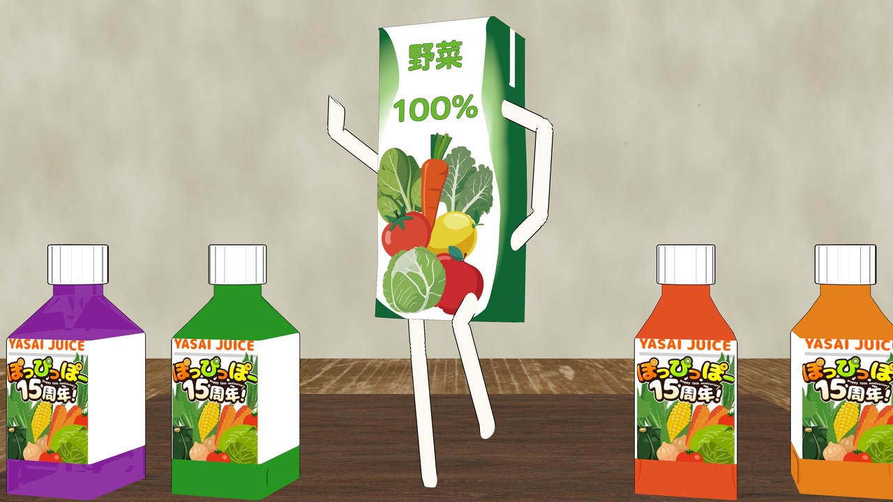 <span style="color: #ff9900; font-size: 24px;"><strong>ぽ</strong></span><span style="color: #f8f800; font-size: 24px;"><strong>っ</strong></span><span style="color: #00ff00; font-size: 24px;"><strong>ぴ</strong></span><span style="color: #ff9900; font-size: 24px;"><strong>っ</strong></span><span style="color: #f8f800; font-size: 24px;"><strong>ぽ</strong></span><span style="color: #ff9900; font-size: 24px;"><strong>ー15周年おめでとう!</strong></span><br><span style="font-size: 18px;">野菜ジュースのMMDアクセはこちら </span><span style="font-size: 18px;"><strong><a href="https://3d.nicovideo.jp/works/td90338" target="_blank" rel="noopener">td90338</a></strong></span><br>お久しぶりです。むちゃるんです。IKがなんか変になってたりしますが見逃してください。<br>作るのに割と時間がかかりましたが、自分の作品らしさを押し出した表現ができて個人的には満足です。<span style="font-size: 10px;">(なおレポートが山になってる模様)</span><br>この動画はぽっぴっぽー15周年投稿祭に参加してます。ボトルのテクスチャは公式素材からお借りしました。<br><span style="font-size: 16px;">前作(?)→ <a href="https://www.nicovideo.jp/watch/sm36678091" class="watch">sm36678091</a></span><br><br><span style="font-size: 18px;">こんな感じの変な3DCG動画が集まるイベント、人類に早すぎるMMD3DCG祭り6を企画してます。詳細→ <a href="https://twitter.com/McharunTv/status/1729465057912963578" target="_blank" rel="noopener nofollow">https://twitter.com/McharunTv/status/1729465057912963578</a></span><br><br><span style="font-size: 16px;">追記<br>2023/12/26のニコニコデイリートピックスに選ばれました。ありがとうございます…!</span>
