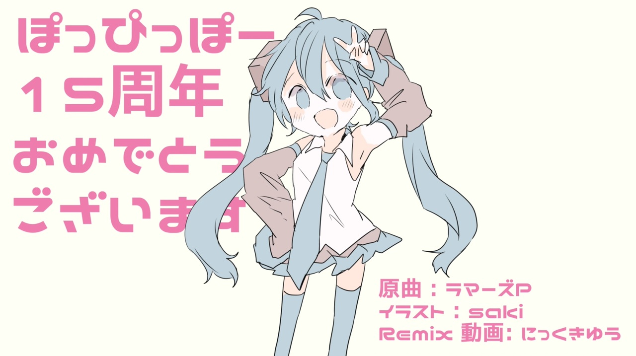 にっくきゆうです!<br>ぽっぴっぽー15周年おめでとうございます!!!!!!!!!<br><br><strong>15年前ミクさんに決められた時からずっと</strong><br><span style="color: #00ff00; font-size: 18px;"><strong>野菜ジュースが大好きです!!!!!!</strong></span><br><br>イラストはおなじみsakiさん!<br>な ん だ こ の か わ い い 生 き も の は !<br><br>ああああああああ弾幕お待ちしております。<br><br>原曲 : ラマーズP【初音ミク】ぽっぴっぽー【本店だよ!!】<br> → <a href="https://www.nicovideo.jp/watch/sm5508956" class="watch">sm5508956</a><br>イラスト : saki ( <a href="https://twitter.com/xxxxxsaki" target="_blank" rel="noopener nofollow">https://twitter.com/xxxxxsaki</a> )<br>Remix 動画: にっくきゆう ( <a href="https://twitter.com/Nick_Kiyu" target="_blank" rel="noopener nofollow">https://twitter.com/Nick_Kiyu</a> )<br>
