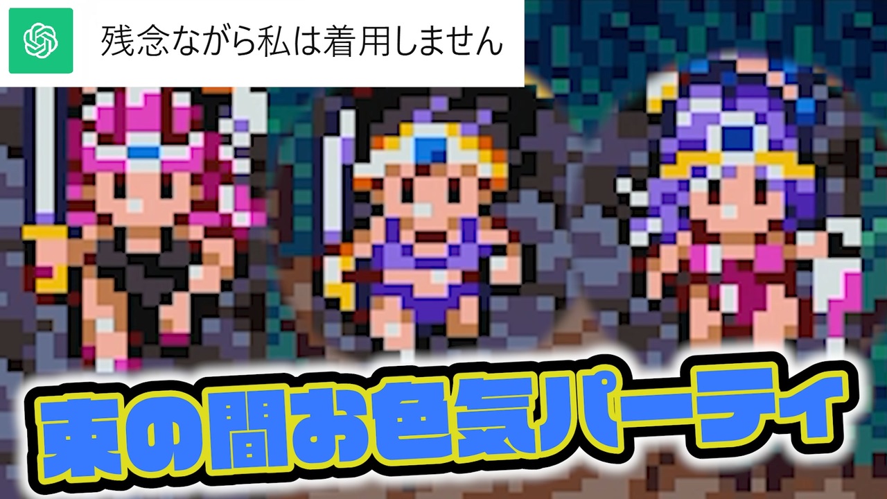 <br><strong>最強装備を整えにいったはずが…</strong><br><br><span style="color: #ff0000;">~基本ルール~-</span><br>①GPTは勇者を殺す為の行動を取る<br>②GPTは魔法使いのキャラとして作成し、その操作は<br>この全ルールを把握したchatGPTに都度聞いて任せる。<br>③GPTはわざと自殺・MP回復拒否するような行動は取れない<br>④GPTはパーティの1番前か1番後ろに配置させる<br>⑤GPTの持ち物や呪文はGPTの意思でしか移動・使用できない<br>⑥買い物時は全てプレイヤーの自由にできる<br>⑦リセットや、データを消去して1からやり直しても良い<br>⑧経験値を伴わない裏での金稼ぎ作業時のみルール全て例外とする<br><br><span style="color: #0000ff;">~禁じ手~</span><br>①操作キャラでGPTに危害を加える行為(危害=ダメージや悪い状態異常など)<br>※メダパニで混乱したせいで殴る、などは許される<br>②戦闘中にGPTが死んだ際に放置(その次のターン中に蘇生させなければいけない)<br>③戦闘開始or終了時にGPTが死んでいる<br>④GPTのMPが0か1の時にHP回復の選択(蘇生も)を<br>GPT以外のメンバーに対して取る ※宿屋系はOK<br>⑤GPT以外の仲間がマホカンタ状態になる<br>⑥GPTがいない状態で戦闘を開始or続けるor勝利(バシルーラ等でいなくなったら逃げる行動のみ可)<br>⑦商人の特技「あなほり」を使うこと <br>⑧しあわせのくつの使用<br>⑨盗賊が盗んだ道具の使用<br><br><span style="color: #38761d;">勇者が死ぬ or 上記を破る度にGPTに強制リセット。「リセット」をする度にGPTに1pt。<br>50pt貯まったらGPTの勝ち。企画終了。</span><br><br><strong>【次】 下のシリーズから飛んでね<br>【part1】 <a href="https://www.nicovideo.jp/watch/sm42595666" class="watch">sm42595666</a> 【投稿動画まとめ】 <a href="https://www.nicovideo.jp/mylist/32090282" target="_blank" rel="noopener">mylist/32090282</a></strong><br><br><span style="color: red;"><strong>▼投稿者情報▼</strong></span><br>【 Twitter 】 <a href="https://twitter.com/wakou2525" target="_blank" rel="noopener nofollow">https://twitter.com/wakou2525</a><br>【生放送コミュ】 co1668349<br>【意見・連絡先】 wakou2525otayori@yahoo.co.jp
