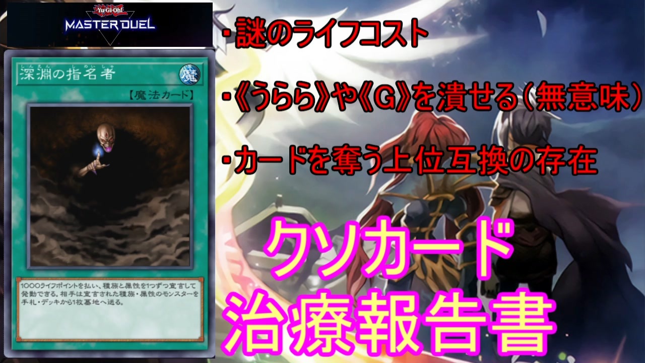 クソカード医学会報告書 第6弾、セカンドオピニオン動画です。<br>なんか最近セカンドオピニオンばっか作ってますが、自分の治療報告書が3,4件溜まっているんですよね……。早くそっちにも着手せねば……。<br><br>今回遊んだゲーム:<br> 遊戯王マスターデュエル <a href="https://www.konami.com/yugioh/masterduel/jp/ja/" target="_blank" rel="noopener nofollow">https://www.konami.com/yugioh/masterduel/jp/ja/</a><br><br>リスペクト先:<br>あまくだり様の待合室動画 <a href="https://www.nicovideo.jp/watch/sm43121443" target="_blank" rel="noopener nofollow">https://www.nicovideo.jp/watch/sm43121443</a><br><br>Special Thanks:撮影協力者の皆さま<br>マルコポーロ様、nexus様、パルミジャーノ根岸様、うぉるたぁ様、ksmgn様<br>その他 非公式医学会サーバーのみなさま<br><br>非公式クソカード医学会サーバー:<a href="https://discord.gg/pejHy5mQFT" target="_blank" rel="noopener nofollow">https://discord.gg/pejHy5mQFT</a><br><br>前回 <a href="https://www.nicovideo.jp/watch/sm42965972" class="watch">sm42965972</a> / 次回 <a href="https://www.nicovideo.jp/watch/sm43228238" class="watch">sm43228238</a><br><br>作った動画 <a href="https://www.nicovideo.jp/mylist/72794101" target="_blank" rel="noopener">mylist/72794101</a>
