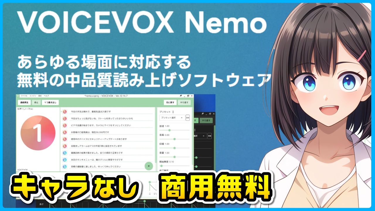 2023年11月17日にリリースされたVOICEVOXの新ブランド『VOICEVOX Nemo』のボイスサンプルや使い方などを詳しく解説します。<br>オリジナルキャラの声を探している方や企業・団体、教育機関の皆さまには特におすすめのソフトです。<br><br>※ 前回の動画から私が直接発信する形式に変えました(独自開発の声に変えてます)。冬霧サイカもたまに出演するので今後ともよろしくお願いします!<br><br>▼VOICEVOX Nemo 公式HP<br><a href="https://voicevox.hiroshiba.jp/nemo/" target="_blank" rel="noopener nofollow">https://voicevox.hiroshiba.jp/nemo/</a><br>▼VOICEVOX 公式HP<br><a href="https://voicevox.hiroshiba.jp/" target="_blank" rel="noopener nofollow">https://voicevox.hiroshiba.jp/</a><br>▼VOICEVOX Q&A<br><a href="https://voicevox.hiroshiba.jp/qa/" target="_blank" rel="noopener nofollow">https://voicevox.hiroshiba.jp/qa/</a><br>▼VOICEVOX マニュアル<br><a href="https://voicevox.hiroshiba.jp/how_to_use/" target="_blank" rel="noopener nofollow">https://voicevox.hiroshiba.jp/how_to_use/</a><br>▼WEB版VOICEVOX<br><a href="https://www.voicevox.su-shiki.com/" target="_blank" rel="noopener nofollow">https://www.voicevox.su-shiki.com/</a><br><br>▼VOICEVOX関連動画<br>■完全解説<br><a href="https://www.nicovideo.jp/watch/sm41877167" class="watch">sm41877167</a><br>■WEB版VOICEVOXの使い方<br><a href="https://www.nicovideo.jp/watch/sm40706448" class="watch">sm40706448</a><br>■便利機能5選<br><a href="https://www.nicovideo.jp/watch/sm40635209" class="watch">sm40635209</a><br>■スマホでずんだもん動画の作り方(準備編)<br><a href="https://www.nicovideo.jp/watch/sm42945533" class="watch">sm42945533</a><br>■スマホでずんだもん動画の作り方(作成編)<br><a href="https://www.nicovideo.jp/watch/sm43015272" class="watch">sm43015272</a><br><br>▼Twitter<br> <a href="https://twitter.com/YuuPro_2022" target="_blank" rel="noopener nofollow">https://twitter.com/YuuPro_2022</a><br><br>▼音声<br>VOICEVOX Nemo<br><br>▼BGM<br>■DOVA-SYNDROME 様:<a href="https://dova-s.jp/" target="_blank" rel="noopener nofollow">https://dova-s.jp/</a><br>■ポケットサウンド 様:<a href="https://pocket-se.info/" target="_blank" rel="noopener nofollow">https://pocket-se.info/</a><br>■PeriTune 様:<a href="https://peritune.com/" target="_blank" rel="noopener nofollow">https://peritune.com/</a>