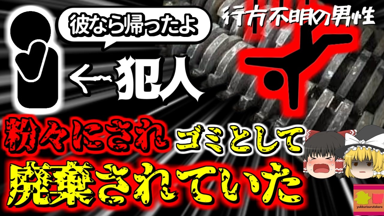 <a href="#" class="seekTime" data-seekTime="00:00" onclick="seekNicoPlayer('#00:00'); return false;">#00:00</a> 冒頭挨拶<br><a href="#" class="seekTime" data-seekTime="00:28" onclick="seekNicoPlayer('#00:28'); return false;">#00:28</a> 廃棄物処理業<br><a href="#" class="seekTime" data-seekTime="1:29" onclick="seekNicoPlayer('#1:29'); return false;">#1:29</a> 視聴上の注意<br><a href="#" class="seekTime" data-seekTime="2:11" onclick="seekNicoPlayer('#2:11'); return false;">#2:11</a> イギリス<br><a href="#" class="seekTime" data-seekTime="2:58" onclick="seekNicoPlayer('#2:58'); return false;">#2:58</a> 本編開始<br><a href="#" class="seekTime" data-seekTime="3:57" onclick="seekNicoPlayer('#3:57'); return false;">#3:57</a> 行方不明になった「Aさん」<br><a href="#" class="seekTime" data-seekTime="4:47" onclick="seekNicoPlayer('#4:47'); return false;">#4:47</a> 彼が消えた日<br><a href="#" class="seekTime" data-seekTime="5:43" onclick="seekNicoPlayer('#5:43'); return false;">#5:43</a> 粉砕機の点検作業<br><a href="#" class="seekTime" data-seekTime="8:58" onclick="seekNicoPlayer('#8:58'); return false;">#8:58</a> その後の裁判<br><br>今回紹介するのは、イギリスで発生した、とある廃棄物工場での事件(事故)です。<br>イギリスのとある地域には、建築業者から排出された、コンクリートガラや木材といった、産業廃棄物を処理する工場がありました。<br>この工場に勤める男性「Aさん」は、この場所で大型粉砕機を扱い、廃材を細かく処理する業務を担当していました。<br>彼は実家で母と暮らしており、いつもほぼ同じ時間に仕事を終えて帰宅していましたが、この日はなぜか、いつになっても彼が帰ってきません。<br>心配した母親は、職場に彼のことを問い合わせると、社長「Bさん」が電話にでて、『Aさんは終業後、すぐに帰りましたよ』と話し、彼はいつもと同じように帰ったと伝えられました。<br>しかし、Aさんは翌朝になっても戻ってこず、母親は彼の友人に連絡したり、彼が立ち寄りそうなところを探してみましたが、Aさんの手がかりすら見つかりませんでした。<br>そこで彼女は、警察に捜索願を提出し、警察による捜索が開始。<br>警察は、職場である産業廃棄物処理場を調べ、社長や従業員から話を聞き、現場に設置されていた、監視カメラの映像を調査しました。<br>するとそこには、行方不明になった当日、屋外の粉砕機で作業をする、AさんとBさんの姿が映っていましたが・・・<br><br><br />※この動画は過去の事件を知り、現在でも同じことが発生する危険性を再認識、関与しないように促すための動画であり、視聴者を扇動、動揺を誘うためのコンテンツではありません。<br><br>ご要望にお応えして、メンバーシップの開設を行いました。<br>下記URLからも登録可能ですので、ご興味がある方は是非ご参加ください。<br><a href="https://www.youtube.com/channel/UCcT5a1J7XJW7CLYI2RKl4pw/join" target="_blank" rel="noopener nofollow">https://www.youtube.com/channel/UCcT5a1J7XJW7CLYI2RKl4pw/join</a><br><br><br>Twitter<br>→<a href="https://twitter.com/yukkurisurutoko" target="_blank" rel="noopener nofollow">https://twitter.com/yukkurisurutoko</a><br><br>取り急ぎ、簡易的にですがマイリストを作りました。<br>【ゆっくり解説】事故・事件関係紹介リスト <br><a href="https://www.nicovideo.jp/mylist/71034319" target="_blank" rel="noopener nofollow">https://www.nicovideo.jp/mylist/71034319</a><br>【ゆっくり解説】放射線系事故<br><a href="https://www.nicovideo.jp/mylist/71034368" target="_blank" rel="noopener nofollow">https://www.nicovideo.jp/mylist/71034368</a><br>【ゆっくり解説】鉄道系事故・事件関連<br><a href="https://www.nicovideo.jp/mylist/71034379" target="_blank" rel="noopener nofollow">https://www.nicovideo.jp/mylist/71034379</a>