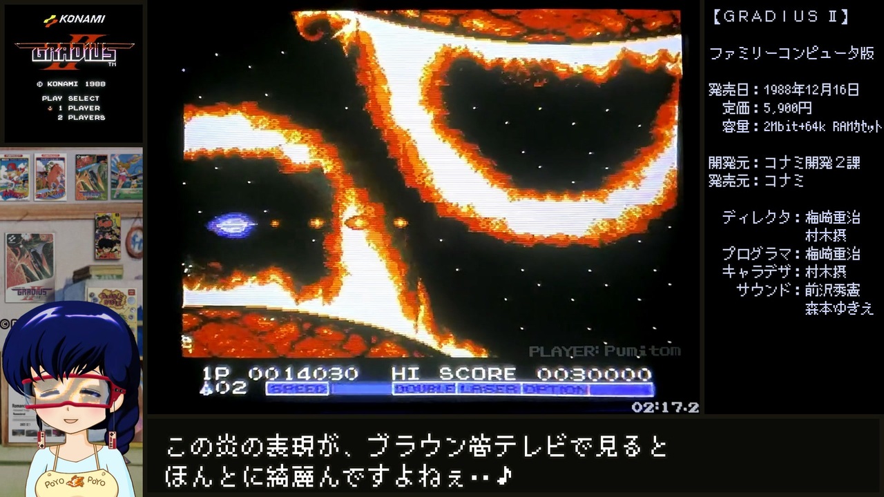 今日で<strong>35周年</strong>のファミコンのSTGのRTAでっす! <br><br><br><span style="color: #38761d;">//備考</span><br>【ブラウン管テレビ】でのファミコンの映像を動画で綺麗に遺せないかな~って画策している動画でっす。<br>(※1080pでの視聴を前提にしてるので、1920x1080未満のサイズだとモアレが酷くなる可能性がありまぁす)<br>(環境: 曲面ブラウン管TV+RF接続)<br><br><span style="color: #ff0000;"><strong>//訂正</strong></span><br>グラⅡのコナミコマンドはタイトル画面で入力だった...! (指摘アリガトゥ!)<br><br><span style="color: #38761d;">//計測区間</span><br>speedrun.com と一緒(ゲーム開始~ボス撃破後画面が切り替わった直後)。<br><a href="https://www.speedrun.com/ja-JP/gradius_ii" target="_blank" rel="noopener nofollow">https://www.speedrun.com/ja-JP/gradius_ii</a><br><br><span style="color: #38761d;">//参考文献 </span><br>FC版グラディウスⅡ 当たり判定を可視化 <a href="https://www.nicovideo.jp/watch/sm27868512" class="watch">sm27868512</a> <br>FC版グラディウスⅡ 1000万点RTA 47:58.00 <a href="https://www.nicovideo.jp/watch/sm36240839" class="watch">sm36240839</a>(ランク解説)<br>初音ミクのうた <a href="https://www.nicovideo.jp/watch/sm8593206" class="watch">sm8593206</a> <br>DQ3のチラツキが発生してるシーン <a href="https://www.nicovideo.jp/watch/sm41961927?from=75" target="_blank" rel="noopener nofollow">https://www.nicovideo.jp/watch/sm41961927?from=75</a> <br>めぞん一刻 <a href="https://amzn.to/3ojH2WC" target="_blank" rel="noopener nofollow">https://amzn.to/3ojH2WC</a> <br>ダイの大冒険 (1991) <a href="https://amzn.to/3zMFvOy" target="_blank" rel="noopener nofollow">https://amzn.to/3zMFvOy</a> <br>お見舞い <a href="https://www.google.com/search?q=%E3%81%8A%E8%A6%8B%E8%88%9E%E3%81%84%20%E3%83%80%E3%82%A6%E3%83%B3%E3%82%BF%E3%82%A6%E3%83%B3" target="_blank" rel="noopener nofollow">https://www.google.com/search?q=%E3%81%8A%E8%A6%8B%E8%88%9E%E3%81%84%20%E3%83%80%E3%82%A6%E3%83%B3%E3%82%BF%E3%82%A6%E3%83%B3</a><br /> <br><br><span style="color: #e69138;">//共通説明文てすと</span><br><span style="color: #ff00ff;"><strong>【New!】</strong></span>F-ZERO RTA:<a href="https://www.nicovideo.jp/watch/sm45660939" class="watch">sm45660939</a><br>【New!】Romancing Sa・Ga2:<a href="https://www.nicovideo.jp/watch/sm44400984" class="watch">sm44400984</a> <br>【New!】らんま½爆烈乱闘篇RTA (WR):<a href="https://www.nicovideo.jp/watch/sm44178414" class="watch">sm44178414</a>(デバイス制限対策版: <a href="https://www.nicovideo.jp/watch/sm44432134" class="watch">sm44432134</a>)<br>【New!】スーパーファミスタRTA:<a href="https://www.nicovideo.jp/watch/sm43890432" class="watch">sm43890432</a><br>【New!】ファミコンRTA落とし穴可視化用アイコン:<a href="https://seiga.nicovideo.jp/seiga/im11438499" target="_blank" rel="noopener">im11438499</a>(←5月23日以降に投稿したのは消えちゃったぽい...?)<br><br>【直撮り】ブラウン管テレビでファミコンする管理人さん:<a href="https://www.nicovideo.jp/series/423780" target="_blank" rel="noopener">series/423780</a><br>【ミンサガ】RTAとか:<a href="https://www.nicovideo.jp/series/416017" target="_blank" rel="noopener">series/416017</a><br>【WS版FF2】RTA:<a href="https://www.nicovideo.jp/series/426767" target="_blank" rel="noopener">series/426767</a><br>【DEAD OR ALIVE】RTA:<a href="https://www.nicovideo.jp/series/79228" target="_blank" rel="noopener">series/79228</a><br>【バブルボブル】RTA:<a href="https://www.nicovideo.jp/series/366167" target="_blank" rel="noopener">series/366167</a><br><span style="font-size: 14px;">【アーケードアーカイブス】</span>RTA:<a href="https://www.nicovideo.jp/series/79229" target="_blank" rel="noopener">series/79229</a>