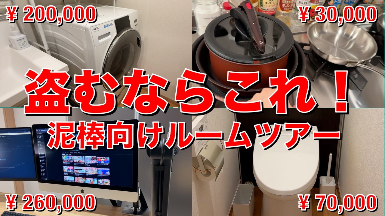 ※ 窃盗は犯罪です<br>※ 10選の10は十進数ではない可能性があります<br>うちの家に泥棒に入った際に何を盗れば良いのかを1本の動画にまとめてみました。室内の設備の使い方やどこに何が収納されているのかについても詳しくご紹介しているので、侵入する前の下見にお使いください。アンケート結果より泥棒向けのルームツアー動画が謎に需要高かったので急いで作成しましたが、うちの家は泥棒にとってはハズレだと思うので期待しないでくださいね。多分隣に家に入った方がいいんじゃないですかね。<br><br>VANS スニーカー VN000EYEBLK: <a href="https://amzn.to/3NuR1pf" target="_blank" rel="noopener nofollow">https://amzn.to/3NuR1pf</a><br>VANS スニーカー VN000EWZBLK: <a href="https://amzn.to/3TmoiXp" target="_blank" rel="noopener nofollow">https://amzn.to/3TmoiXp</a><br>TOTO 音姫 YES400DR: <a href="https://amzn.to/3Nu0j4y" target="_blank" rel="noopener nofollow">https://amzn.to/3Nu0j4y</a><br>Zwilling 三徳 30917-181: <a href="https://amzn.to/3RGT4sO" target="_blank" rel="noopener nofollow">https://amzn.to/3RGT4sO</a><br>Zwilling ペティ 30910-131: <a href="https://amzn.to/3RrG8pm" target="_blank" rel="noopener nofollow">https://amzn.to/3RrG8pm</a><br>Zwilling 筋引き 30910-231: <a href="https://amzn.to/3RJNndG" target="_blank" rel="noopener nofollow">https://amzn.to/3RJNndG</a><br>T-fal 7点セット L38395A: <a href="https://amzn.to/3NvDvS9" target="_blank" rel="noopener nofollow">https://amzn.to/3NvDvS9</a><br>Zwilling フライパン 64098-200: <a href="https://amzn.to/46ZkePZ" target="_blank" rel="noopener nofollow">https://amzn.to/46ZkePZ</a><br>Zwilling 料理バサミ 41470-000: <a href="https://amzn.to/3tiAfma" target="_blank" rel="noopener nofollow">https://amzn.to/3tiAfma</a><br>DAIYA 鰹節削り器 赤香 青紙×ブナ: <a href="https://amzn.to/41mwUzb" target="_blank" rel="noopener nofollow">https://amzn.to/41mwUzb</a><br>SUNTORY Ballantine 12年: <a href="https://amzn.to/4akGeHU" target="_blank" rel="noopener nofollow">https://amzn.to/4akGeHU</a><br>Google Pixel 7a: <a href="https://amzn.to/4aju8ii" target="_blank" rel="noopener nofollow">https://amzn.to/4aju8ii</a><br>Apple AirPods Pro Gen3: <a href="https://amzn.to/3v4CbQ0" target="_blank" rel="noopener nofollow">https://amzn.to/3v4CbQ0</a><br>Audio-technica マイク AT2020: <a href="https://amzn.to/470yc3S" target="_blank" rel="noopener nofollow">https://amzn.to/470yc3S</a><br>Apple iPad Air, 2022: <a href="https://amzn.to/3RKA5h1" target="_blank" rel="noopener nofollow">https://amzn.to/3RKA5h1</a><br>PFU HHKB Professional HYBRID Type-S: <a href="https://amzn.to/47YrVae" target="_blank" rel="noopener nofollow">https://amzn.to/47YrVae</a><br>GoPro Hero 11: <a href="https://amzn.to/41qoYgb" target="_blank" rel="noopener nofollow">https://amzn.to/41qoYgb</a><br>DJI Mic: <a href="https://amzn.to/3Ntkeku" target="_blank" rel="noopener nofollow">https://amzn.to/3Ntkeku</a><br>SwitchBot 見守りカメラ W3101100: <a href="https://amzn.to/3GQcmW9" target="_blank" rel="noopener nofollow">https://amzn.to/3GQcmW9</a><br /><br>★各種SNSリンク<br>Twitter: <a href="https://twitter.com/yoidea" target="_blank" rel="noopener nofollow">https://twitter.com/yoidea</a><br>Instagram: <a href="https://www.instagram.com/yoidea" target="_blank" rel="noopener nofollow">https://www.instagram.com/yoidea</a><br>TikTok: <a href="https://www.tiktok.com/@yoidea" target="_blank" rel="noopener nofollow">https://www.tiktok.com/@yoidea</a><br><br>★連絡先<br>お問い合わせフォーム: <a href="https://forms.gle/wJam18y3fUfZfrjFA" target="_blank" rel="noopener nofollow">https://forms.gle/wJam18y3fUfZfrjFA</a><br>PGP公開鍵: <a href="https://ラムダ.com/pgp" target="_blank" rel="noopener nofollow">https://ラムダ.com/pgp</a>