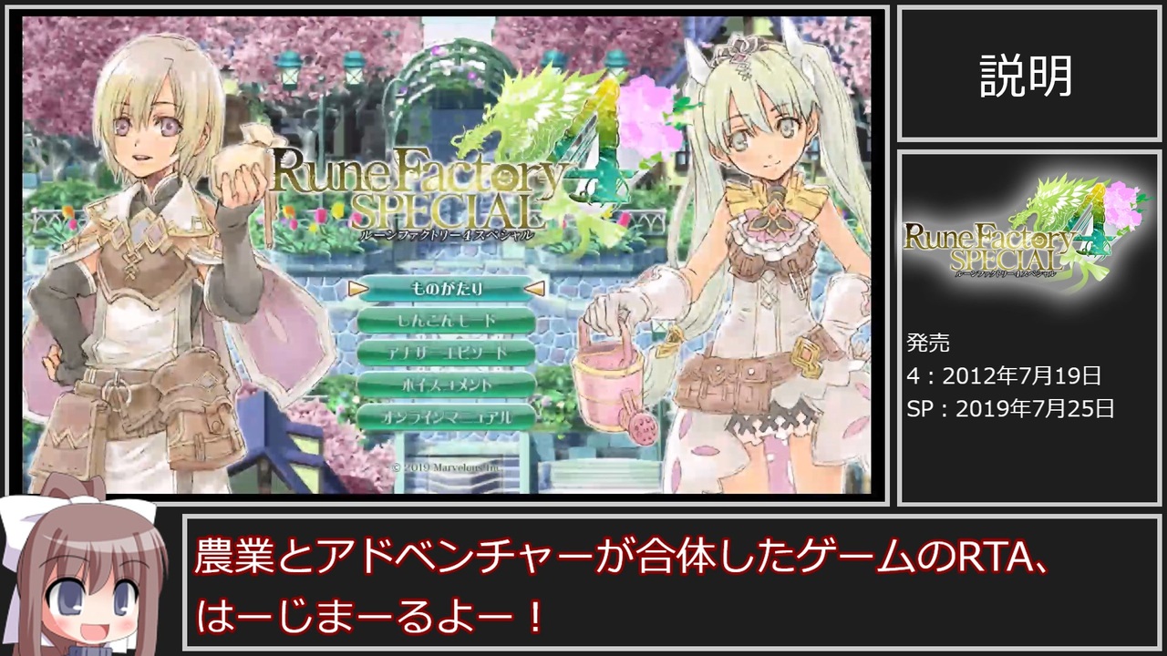 【RTA】ルーンファクトリー4 Beat 3rd Arc 3:15:09 part1<br><br><strong>※ビシュナル指摘兄貴、ありがとナス!<br>(毎回なんかのミスやってて反省します...)<br><br>※※色んな人が見てくれてありがたいゾ!編集も大変だけど頑張ります!<br> 広告もありがとナス!<br><br><br>二人は幸せな接吻をして終了兄貴、デブでよろよろの太陽兄貴、ペンタゴン田中兄貴、<br>ティガー兄貴、アストラ兄貴、so-da兄貴、エリクス兄貴、矢老兄貴、[エトセトーラ]兄貴、<br>かなぎ兄貴、不変兄貴、ユッケ兄貴、GNZ兄貴、高葉氏兄貴、与兵衛3兄貴、キキ兄貴、朝比奈兄貴、<br>太陽さん兄貴、CV兄貴、4049兄貴、アリスマチック兄貴、めーぼう兄貴、ぷらくてぃす兄貴、<br>ニコニコの純朴な青年兄貴、カーネル兄貴、<br>広告ありがとナス!</strong><br> <br>2時間経過からの運ゲーは本当に良くない。<br> <br>Part2→<a href="https://www.nicovideo.jp/watch/sm43170262" class="watch">sm43170262</a><br> <br> <br>・計測期間<br>はじめからを選択~最後のセルザの会話の終了<br> <br>・レギュレーション<br>Beat 3rd Arc <br> <br>・ルール<br>特になし<br> <br>・ハード:Switch<br> <br>参考にした先駆者兄貴たち<br><a href="https://www.nicovideo.jp/watch/sm30286216" class="watch">sm30286216</a><br> <br>#ルーンファクトリー4<br>#RTA<br>#ゆっくり実況<br>#biimシステム<br>