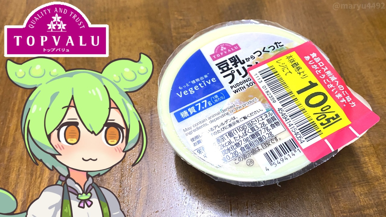 豆乳からつくったプリンです。<br><br><br>【参考】<br>豆乳からつくったプリン(トップバリュ)<br><a href="https://www.topvalu.net/items/detail/4549414154054/" target="_blank" rel="noopener nofollow">https://www.topvalu.net/items/detail/4549414154054/</a><br>株式会社ふじや食品<br><a href="https://www.fuziya-food.co.jp/" target="_blank" rel="noopener nofollow">https://www.fuziya-food.co.jp/</a><br>プッチンプリン 67g×3(グリコ)<br><a href="https://www.glico.com/jp/product/yogurt_pudding/pucchinpudding/43753/" target="_blank" rel="noopener nofollow">https://www.glico.com/jp/product/yogurt_pudding/pucchinpudding/43753/</a><br>明治の食育 自分好みのプリンを作ろう(明治)<br><a href="https://www.meiji.co.jp/meiji-shokuiku/homework/experiment/pudding/" target="_blank" rel="noopener nofollow">https://www.meiji.co.jp/meiji-shokuiku/homework/experiment/pudding/</a><br>【プッチンプリン】焼いていますか(グリコ)<br><a href="https://customer.glico.com/s/article/%E3%83%97%E3%83%83%E3%83%81%E3%83%B3%E3%83%97%E3%83%AA%E3%83%B3-%E7%84%BC%E3%81%84%E3%81%A6%E3%81%84%E3%81%BE%E3%81%99%E3%81%8B" target="_blank" rel="noopener nofollow">https://customer.glico.com/s/article/%E3%83%97%E3%83%83%E3%83%81%E3%83%B3%E3%83%97%E3%83%AA%E3%83%B3-%E7%84%BC%E3%81%84%E3%81%A6%E3%81%84%E3%81%BE%E3%81%99%E3%81%8B</a><br>タイの豆乳事情(なんでもわかる豆乳あるあるマップ)<br><a href="https://www.tounyu.jp/tounyu-life/archives/2086" target="_blank" rel="noopener nofollow">https://www.tounyu.jp/tounyu-life/archives/2086</a><br>豆乳消費量の世界比較(日本豆乳協会)<br><a href="https://www.tounyu.jp/database/international.html" target="_blank" rel="noopener nofollow">https://www.tounyu.jp/database/international.html</a><br><br><br>【使用した素材】(※敬称略)<br>(合成音声)VOICEVOX/ずんだもん/四国めたん/<br><a href="https://voicevox.hiroshiba.jp/" target="_blank" rel="noopener nofollow">https://voicevox.hiroshiba.jp/</a><br>(立ち絵)坂本アヒル<br><a href="https://seiga.nicovideo.jp/seiga/im10788496" target="_blank" rel="noopener">im10788496</a>/<a href="https://seiga.nicovideo.jp/seiga/im10791276" target="_blank" rel="noopener">im10791276</a><br>(楽曲)甘茶の音楽工房/「楽しい麦畑」<br><a href="https://amachamusic.chagasi.com/" target="_blank" rel="noopener nofollow">https://amachamusic.chagasi.com/</a>