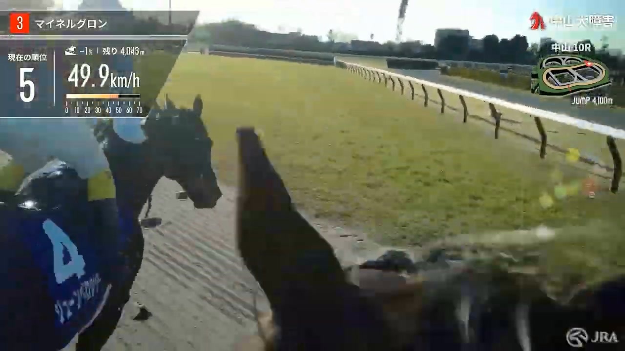 2023年中山大障害(J・GⅠ)でマイネルグロンに騎乗した石神深一騎手の目線カメラ【ジョッキーカメラ】の映像です。<br><br>【レース概要】<br>2023年12月23日(土曜) 5回中山7日 発走時刻:15時05分<br>天候 晴<br>芝 良<br>10レース<br>第146回 中山大障害(J・GⅠ)<br>4,100メートル(芝)