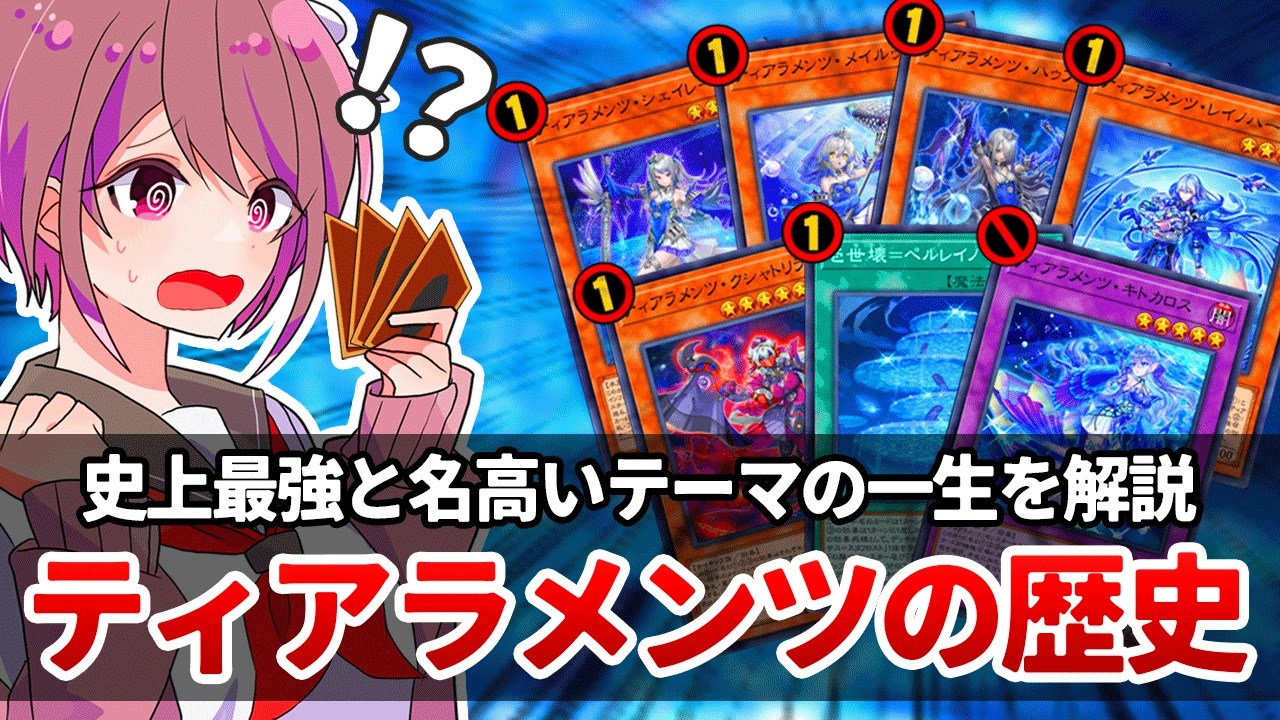 歴代最強のパワーを持ったデッキとも言われているテーマ、ティアラメンツの歴史解説です。<br>1回くらい長尺の動画を作ってみようと思い二カ月前から着手しましたが、めちゃくちゃ大変ですねこれ…ちょびちょびやっていました。<br><br><a href="#" class="seekTime" data-seekTime="00:00" onclick="seekNicoPlayer('#00:00'); return false;">#00:00</a> 概要<br><a href="#" class="seekTime" data-seekTime="00:37" onclick="seekNicoPlayer('#00:37'); return false;">#00:37</a> 第1章:生誕<br><a href="#" class="seekTime" data-seekTime="08:48" onclick="seekNicoPlayer('#08:48'); return false;">#08:48</a> 第2章:現冥<br><a href="#" class="seekTime" data-seekTime="15:22" onclick="seekNicoPlayer('#15:22'); return false;">#15:22</a> 第3章:覚醒<br><a href="#" class="seekTime" data-seekTime="23:22" onclick="seekNicoPlayer('#23:22'); return false;">#23:22</a> 第4章:禁忌<br><a href="#" class="seekTime" data-seekTime="27:35" onclick="seekNicoPlayer('#27:35'); return false;">#27:35</a> 最終章:崩壊<br><a href="#" class="seekTime" data-seekTime="32:30" onclick="seekNicoPlayer('#32:30'); return false;">#32:30</a> ティアラメンツの問題点<br><a href="#" class="seekTime" data-seekTime="35:24" onclick="seekNicoPlayer('#35:24'); return false;">#35:24</a> それでもなお愛されたティアラメンツ<br><br>多分これが今年最後の動画になると思います!<br>今年も沢山再生やコメントをありがとうございます!<br>おかげさまで投稿者もニコニコしながら投稿を続けられました!ニコニコ動画最高!<br>皆さんよいお年を!<br><br>動画上で紹介させて頂いたティアラメンツマーカーの制作者さん<br><a href="https://twitter.com/yappa_neruwa" target="_blank" rel="noopener nofollow">https://twitter.com/yappa_neruwa</a><br /><br>【素材・制作者様】<br><a href="https://kahaduxxxe.booth.pm/" target="_blank" rel="noopener nofollow">https://kahaduxxxe.booth.pm/</a><br><a href="https://twitter.com/akr_1020" target="_blank" rel="noopener nofollow">https://twitter.com/akr_1020</a><br>※許可を得て使用しております。<br><br>【Twitter】<br><a href="https://twitter.com/pi_ni_ki" target="_blank" rel="noopener nofollow">https://twitter.com/pi_ni_ki</a><br><br>【支援絵アルバム】<br><a href="https://note.com/pix989/n/nf5aab604fd77" target="_blank" rel="noopener nofollow">https://note.com/pix989/n/nf5aab604fd77</a>
