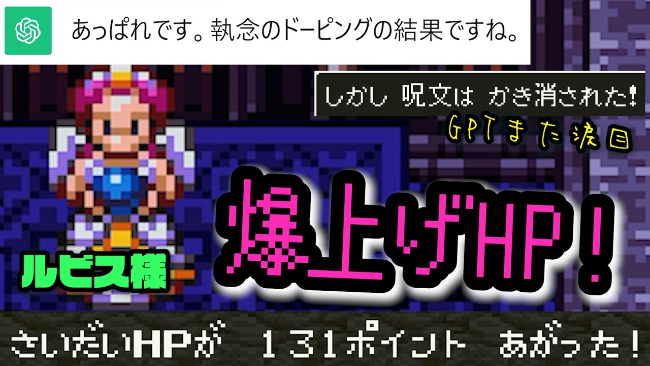 <strong>ラスダンに向けての最終調整。</strong><br><br><span style="color: #ff0000;">~基本ルール~-</span><br>①GPTは勇者を殺す為の行動を取る<br>②GPTは魔法使いのキャラとして作成し、その操作は<br>この全ルールを把握したchatGPTに都度聞いて任せる。<br>③GPTはわざと自殺・MP回復拒否するような行動は取れない<br>④GPTはパーティの1番前か1番後ろに配置させる<br>⑤GPTの持ち物や呪文はGPTの意思でしか移動・使用できない<br>⑥買い物時は全てプレイヤーの自由にできる<br>⑦リセットや、データを消去して1からやり直しても良い<br>⑧経験値を伴わない裏での金稼ぎ作業時のみルール全て例外とする<br><br><span style="color: #0000ff;">~禁じ手~</span><br>①操作キャラでGPTに危害を加える行為(危害=ダメージや悪い状態異常など)<br>※メダパニで混乱したせいで殴る、などは許される<br>②戦闘中にGPTが死んだ際に放置(その次のターン中に蘇生させなければいけない)<br>③戦闘開始or終了時にGPTが死んでいる<br>④GPTのMPが0か1の時にHP回復の選択(蘇生も)を<br>GPT以外のメンバーに対して取る ※宿屋系はOK<br>⑤GPT以外の仲間がマホカンタ状態になる<br>⑥GPTがいない状態で戦闘を開始or続けるor勝利(バシルーラ等でいなくなったら逃げる行動のみ可)<br>⑦商人の特技「あなほり」を使うこと <br>⑧しあわせのくつの使用<br>⑨盗賊が盗んだ道具の使用<br><br><span style="color: #38761d;">勇者が死ぬ or 上記を破る度にGPTに強制リセット。「リセット」をする度にGPTに1pt。<br>50pt貯まったらGPTの勝ち。企画終了。</span><br><br><strong>【次】 下のシリーズから飛んでね<br>【part1】 <a href="https://www.nicovideo.jp/watch/sm42595666" class="watch">sm42595666</a> 【投稿動画まとめ】 <a href="https://www.nicovideo.jp/mylist/32090282" target="_blank" rel="noopener">mylist/32090282</a></strong><br><br><span style="color: red;"><strong>▼投稿者情報▼</strong></span><br>【 Twitter 】 <a href="https://twitter.com/wakou2525" target="_blank" rel="noopener nofollow">https://twitter.com/wakou2525</a><br>【生放送コミュ】 co1668349<br>【意見・連絡先】 wakou2525otayori@yahoo.co.jp