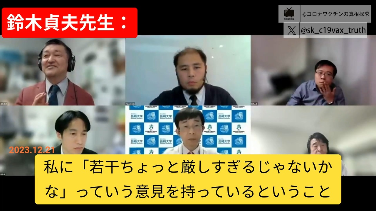 推進派の医師たち口をそろって「現時点の知見常識で昔を批判することは「厳しすぎる」」<br>鈴木貞夫先生:<br>・オミクロン変異株が現れることがわからなかったから、批判されるのは厳しい<br>野村哲彦先生:<br>・今わかった情報で三四年前を批判するのは厳しい<br>中村幸嗣先生:<br>・やりすぎてたっていうことは間違い<br>・鈴木先生、野村先生に同意。<br>新田先生:<br>・当時も反対する人は正しかった。<br>・当時間違ったことを言った人は、考えの大枠が間違ってた。これからも間違う。<br>楊井弁護士:<br>・やりすぎだの議論は当初からあったが、ほとんど書きかき消された<br>モンタニエ博士:<br>・科学的なミス、医療的なミス!<br>・ワクチンがあるから、変異株が出るんだ!<br>元動画:<a href="https://www.youtube.com/watch?v=pIq0LC5COuQ" target="_blank" rel="noopener nofollow">https://www.youtube.com/watch?v=pIq0LC5COuQ</a><br><br><a target="_blank" href="https://qa.nicovideo.jp/faq/show/19424?site_domain=default" style="font-size: 13px;color: #657586; text-decoration: underline; line-height: 1.4">この動画は投稿者によって修正されました</a>