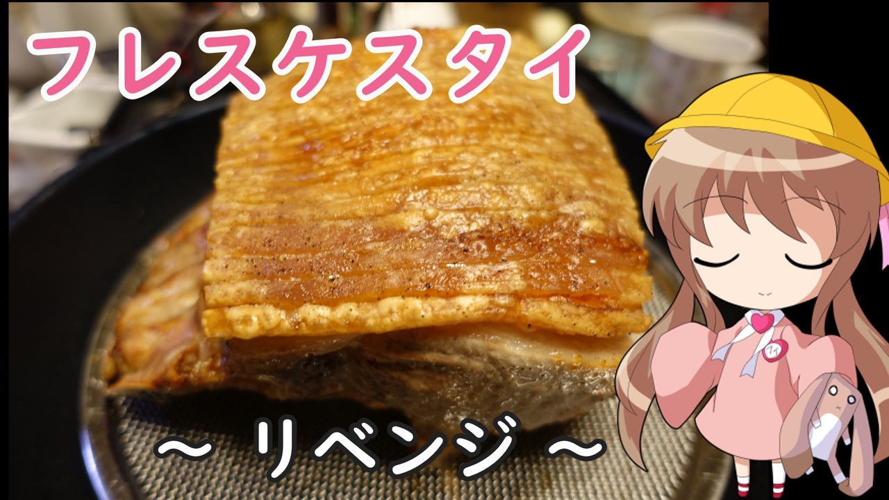 今年最後は、今年1月に投稿したフレスケスタイのリベンジとなります。<br>まだ完全ではありませんが、皮を完全に焼きつつ肉自体の火の通しを自由に調整できるレシピを構築できました。<br>参考になれば幸いです。<br>それでは皆様良いお年を。<br><br>以前作ったフレスケスタイ → <a href="https://www.nicovideo.jp/watch/sm41674712" class="watch">sm41674712</a><br><br>【材料】4人前<br>皮付き・骨付きの豚ロース肉 1kg<br>塩 11g(肉の1.1%)<br>黒コショウ 適量<br><br>樽モグラさんに再走いただきました! → <a href="https://www.nicovideo.jp/watch/sm43666035" class="watch">sm43666035</a><br><br /><br>使い方がよくわかってないTwitter<br><a href="https://twitter.com/hebikun99" target="_blank" rel="noopener nofollow">https://twitter.com/hebikun99</a>