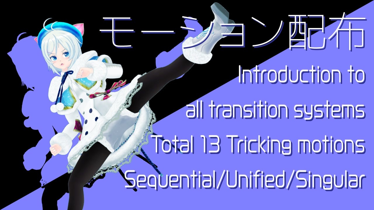 トリッキングは、様々なアクロバット技を途切れなく繰り出していく競技ですが<br>その技(トリック)は<span style="color: #262626;">「トランジション」</span>という動作によって接続されています。<br>着地・踏切の方法によって全13種に定義されるすべての手続きを、成立要件を添えてご紹介。<br>とりあえずアクロバットモーションいっぱい作ったので、気軽にDLしてみてね。<br><br><a href="https://bowlroll.net/file/311740" target="_blank" rel="noopener nofollow">https://bowlroll.net/file/311740</a><br><br>↓↓こちらもご贔屓に↓↓<br><br>★モーション配布動画★<br><a href="https://www.nicovideo.jp/watch/sm41433191" class="watch">sm41433191</a> 【モーション配布】アクロバット少女シロのトリッキング解説<br><a href="https://www.nicovideo.jp/watch/sm42338316" class="watch">sm42338316</a> 【モーション配布】ブレイキン少女シロでトーマスの色々な入り方<br><br>お借りしたもの↓<br><br>電脳少女シロ(c)Siro YouTuber<br><a href="https://3d.nicovideo.jp/works/td31882" target="_blank" rel="noopener nofollow">https://3d.nicovideo.jp/works/td31882</a><br><br>ステージ:ニクムニ様 - <a href="https://seiga.nicovideo.jp/seiga/im5658851" target="_blank" rel="noopener">im5658851</a><br><br><br>※詳細は動画クレジットにて<br><br><br>つくったやつ<br><br><a href="https://www.nicovideo.jp/mylist/66996343" target="_blank" rel="noopener">mylist/66996343</a>