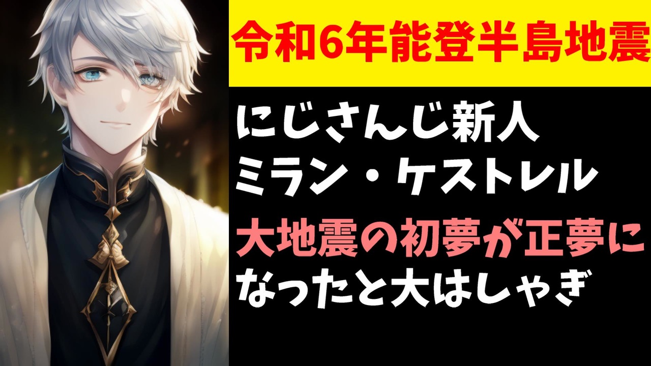2024年1月1日、令和6年能登半島地震が発生。にじさんじの新人でバーチャルタレントアカデミー(VTA)出身のミラン・ケストレルさんが自分の初夢が大地震で正夢になったとツイッターではしゃぎ謝罪されました。<br><br>引用<br><a href="https://twitter.com/Milan_Kestrel/status/1741749714285158554" target="_blank" rel="noopener nofollow">https://twitter.com/Milan_Kestrel/status/1741749714285158554</a><br><br>Youtube <a href="https://www.youtube.com/@V_Virgin_Mary" target="_blank" rel="noopener nofollow">https://www.youtube.com/@V_Virgin_Mary</a><br>twitter <a href="https://twitter.com/V_Virgin_Mary" target="_blank" rel="noopener nofollow">https://twitter.com/V_Virgin_Mary</a><br><br>使用素材<br>高品質なフリー動画素材 - Pixabay <a href="https://pixabay.com/ja/videos" target="_blank" rel="noopener nofollow">https://pixabay.com/ja/videos</a>