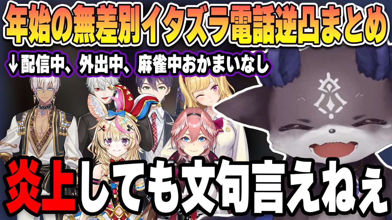 他にもたくさんいるので是非元配信も!<br><br>0:00 配信中のポルカ(ホロライブ)にイタ電<br><a href="#" class="seekTime" data-seekTime="2:17" onclick="seekNicoPlayer('#2:17'); return false;">#2:17</a> にじさんじ公式番組中の所にイタ電<br><a href="#" class="seekTime" data-seekTime="5:16" onclick="seekNicoPlayer('#5:16'); return false;">#5:16</a> 鷹嶺ルイ(ホロライブ)へのイタ電<br><a href="#" class="seekTime" data-seekTime="7:55" onclick="seekNicoPlayer('#7:55'); return false;">#7:55</a> 葛葉へのイタ電(次の人への質問を考える)<br><a href="#" class="seekTime" data-seekTime="11:10" onclick="seekNicoPlayer('#11:10'); return false;">#11:10</a> 剣持へのイタ電(下世話な最悪な質問)<br><a href="#" class="seekTime" data-seekTime="15:27" onclick="seekNicoPlayer('#15:27'); return false;">#15:27</a> 鷹宮リオン(初詣で外出中)へのイタ電<br><a href="#" class="seekTime" data-seekTime="17:38" onclick="seekNicoPlayer('#17:38'); return false;">#17:38</a> イブラヒムへイタ電したら仲良しオフ麻雀大会が開催してた<br><br><br>▼元動画はこちら↓<br>【検証】年始にいきなり電話かけたらだれがでんの?【でびでび・でびる/にじさんじ】<br><a href="https://www.youtube.com/watch?v=VJpisqWHPyI" target="_blank" rel="noopener nofollow">https://www.youtube.com/watch?v=VJpisqWHPyI</a><br>【だらだら皆と年越し万歳】ゆくホロ同時視聴とhololive COUNTDOWN LIVEミラー配信で年越しキメ!!!!!!!!wwwwwwwwwww【尾丸ポルカ/ホロライブ】<br><a href="https://www.youtube.com/watch?v=CZsaaJt3RGo&t=6944s" target="_blank" rel="noopener nofollow">https://www.youtube.com/watch?v=CZsaaJt3RGo&t=6944s</a><br>【#年越しにじ34】にじ3→4 年越し特番 ~喋ろう!歌おう!ゲームしよう!~<br><a href="https://www.youtube.com/watch?v=soxEueAbxnA" target="_blank" rel="noopener nofollow">https://www.youtube.com/watch?v=soxEueAbxnA</a><br><br><br>▼登場ライバー達<br>〇でびでび・でびる<br><a href="https://www.youtube.com/channel/UCjlmCrq4TP1I4xguOtJ-31" target="_blank" rel="noopener nofollow">https://www.youtube.com/channel/UCjlmCrq4TP1I4xguOtJ-31</a><br>〇尾丸ポルカ<br><a href="https://www.youtube.com/channel/UCK9V2B22uJYu3N7eR_BT9QA" target="_blank" rel="noopener nofollow">https://www.youtube.com/channel/UCK9V2B22uJYu3N7eR_BT9QA</a><br>〇鷹嶺ルイ<br><a href="https://www.youtube.com/channel/UCs9_O1tRPMQTHQ-N_L6FU2g" target="_blank" rel="noopener nofollow">https://www.youtube.com/channel/UCs9_O1tRPMQTHQ-N_L6FU2g</a><br>〇葛葉<br><a href="https://www.youtube.com/channel/UCSFCh5NL4qXrAy9u-u2lX3g" target="_blank" rel="noopener nofollow">https://www.youtube.com/channel/UCSFCh5NL4qXrAy9u-u2lX3g</a><br>〇剣持刀也<br><a href="https://www.youtube.com/channel/UCv1fFr156jc65EMiLbaLImw" target="_blank" rel="noopener nofollow">https://www.youtube.com/channel/UCv1fFr156jc65EMiLbaLImw</a><br>〇鷹宮リオン<br><a href="https://www.youtube.com/channel/UCV5ZZlLjk5MKGg3L0n0vbzw" target="_blank" rel="noopener nofollow">https://www.youtube.com/channel/UCV5ZZlLjk5MKGg3L0n0vbzw</a><br>〇イブラヒム<br><a href="https://www.youtube.com/channel/UCmZ1Rbthn-6Jm_qOGjYsh5A" target="_blank" rel="noopener nofollow">https://www.youtube.com/channel/UCmZ1Rbthn-6Jm_qOGjYsh5A</a><br><br>Youtube ver<br><a href="https://youtu.be/o395-u2WGGE" target="_blank" rel="noopener nofollow">https://youtu.be/o395-u2WGGE</a><br><br>