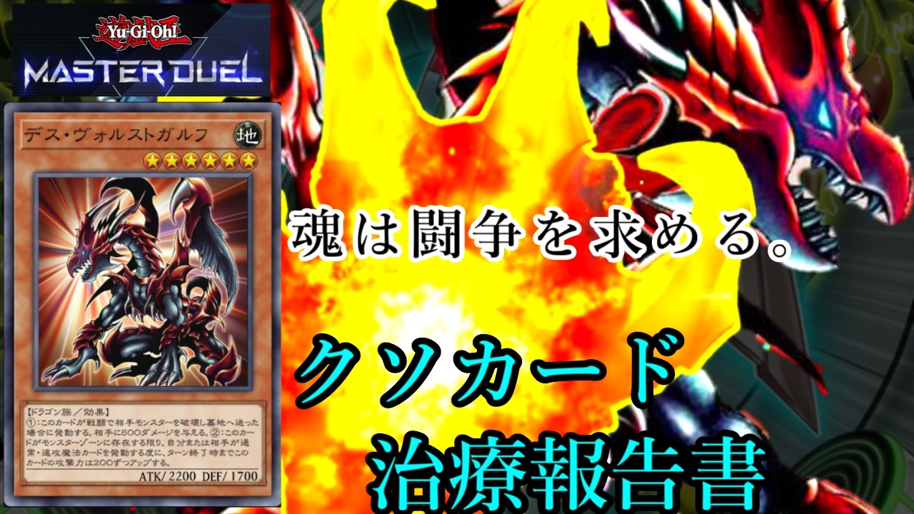あけましておめでとうございます。今年もよろしくお願いします。<br><br>クソカード医学会報告書、第7弾です。辰年らしいドラゴン族です。<br>本家医学会に持ち込んだデッキですが、2か月も経ってしまいました。<br>ちなみに《ぶつかり合う魂》はレガシーURですが、私は3枚とも素引きしています。<br><br>エンコード後にプレミ発見。1戦目では「あの合体モンスター」で自爆特攻することでリーサルに届かせられていました。<br><br><span style="color: #ff0000;">追記1:サムネイルを変更しました(2024/01/04)<br><br>追記2:広告ありがとうございます!<br>ピピピ さん、リリリリリットン さん、運命計画 さん、Lemo さん、satanail さん、F_tyuni さん、投石部隊 さん、satanail さん、Raichu さん<br><br>追記3:《A宝玉獣 ルビー・カーバンクル》の画像についてですが、アバター用アイコンを変更した際の編集ミスです!</span><br><br>今回遊んだゲーム:<br> 遊戯王マスターデュエル <a href="https://www.konami.com/yugioh/masterduel/jp/ja/" target="_blank" rel="noopener nofollow">https://www.konami.com/yugioh/masterduel/jp/ja/</a><br><br>リスペクト先:<br>あまくだり 様 <a href="https://www.nicovideo.jp/user/82678858" target="_blank" rel="noopener nofollow">https://www.nicovideo.jp/user/82678858</a><br><br>11月の本家医学会配信:<br><a href="https://www.youtube.com/live/JiTV3tfcM0E?si=vZiVJFQT8i2s0zGR&t=10388" target="_blank" rel="noopener nofollow">https://www.youtube.com/live/JiTV3tfcM0E?si=vZiVJFQT8i2s0zGR&t=10388</a><br><br>Special Thanks:<br>・《投石部隊》 パルミジャーノ根岸 様<br>・《マイクロ・コーダー》 紫紅魔 様<br>・《ヴォルカニック・バレット》 謙虚なツモ 様<br>・《清冽の水霊使いエリア》 Lemo 様<br>・《白銀の城のラビュリンス》 雪月 様<br>・《ジェムナイト・エメラル》 MATSUO 様<br>その他 デッキ相談、対戦にご協力いただいた非公式医学会サーバーのみなさま<br><br>非公式クソカード医学会サーバー:<a href="https://discord.gg/pejHy5mQFT" target="_blank" rel="noopener nofollow">https://discord.gg/pejHy5mQFT</a><br><br>使用させていただいた立ち絵:<br> あかりちゃんの立ち絵 (《しりんだーふれいる》様) <a href="https://seiga.nicovideo.jp/seiga/im10639876" target="_blank" rel="noopener nofollow">https://seiga.nicovideo.jp/seiga/im10639876</a><br><br>前回 <a href="https://www.nicovideo.jp/watch/sm43136449" class="watch">sm43136449</a> / 次回 <a href="https://www.nicovideo.jp/watch/sm43311535" class="watch">sm43311535</a><br><br>作った動画 <a href="https://www.nicovideo.jp/mylist/72794101" target="_blank" rel="noopener">mylist/72794101</a>