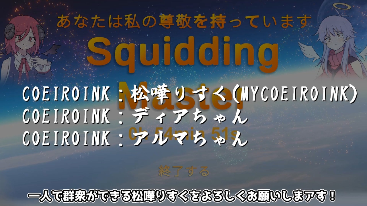 <span style="font-size: 16px;"><strong>COEIROINK:松嘩りすく(MYCOEIROINK)<br><a href="https://commons.nicovideo.jp/material/nc282245" target="_blank" rel="noopener nofollow">https://commons.nicovideo.jp/material/nc282245</a><br>Squidding Over It</strong></span><br><strong><a href="https://store.steampowered.com/app/2517560/Squidding_Over_It/" target="_blank" rel="noopener nofollow">https://store.steampowered.com/app/2517560/Squidding_Over_It/</a></strong><br><br><span style="font-size: 16px;"><strong>COEIROINK: <a href="https://coeiroink.com/download" target="_blank" rel="noopener nofollow">https://coeiroink.com/download</a><br>COEIROINK:ディアちゃん<br>COEIROINK:アルマちゃん</strong></span><br><br><br><br><a target="_blank" href="https://qa.nicovideo.jp/faq/show/19424?site_domain=default" style="font-size: 13px;color: #657586; text-decoration: underline; line-height: 1.4">この動画は投稿者によって修正されました</a>