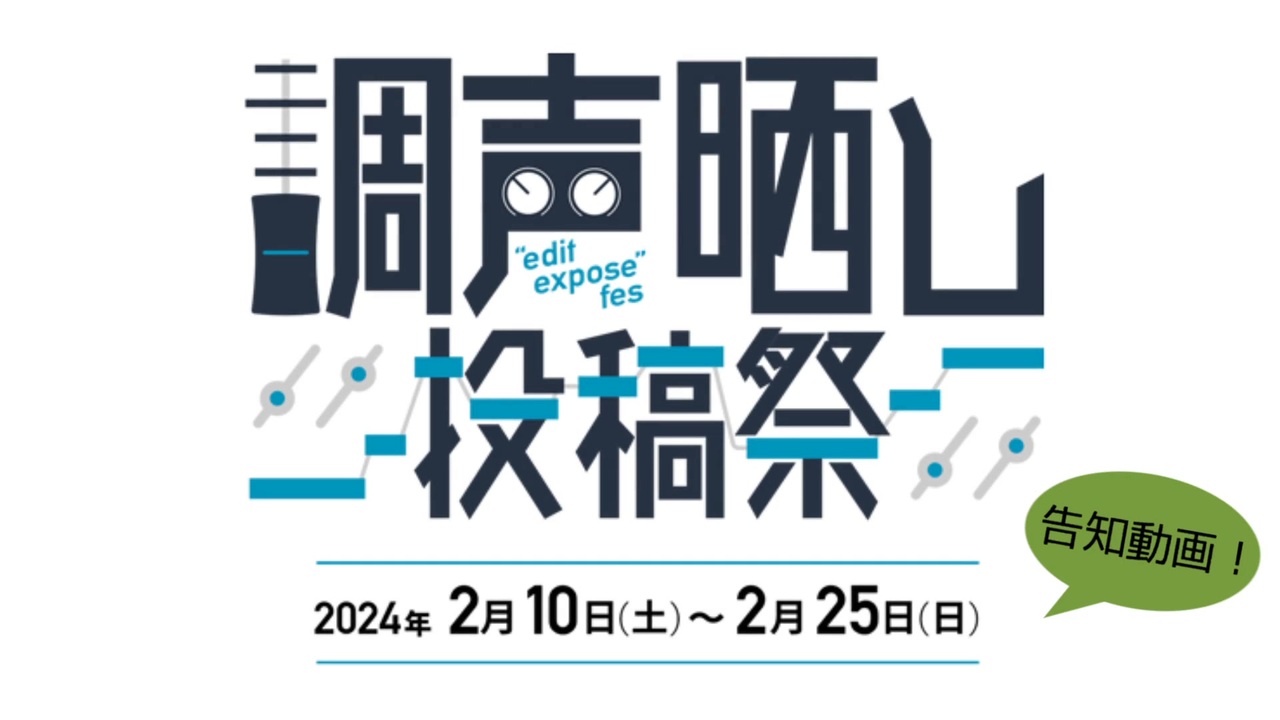 今年もやります!調声晒し投稿祭!<br>今回は買ったっきり眠っていたSynthVテトさんと、<br>なぜか我が家に紛れ込んでいたずんだもんが告知をやってくれるようです…?<br><br><br>【調声晒し投稿祭とは?】<br>音声合成ソフトを使用した歌唱や喋りを作成し、<br>調声(調教)やMIXの様子がわかる動画を投稿するお祭りです!<br><br>歌を調声するソング部門、喋りを調声するトーク部門があります。<br><br><br>【日程】<br>2/10(土)16:00 ~ 2/25(日)24:00 (遅刻組もOK!)<br><br><br>【開催場所】<br>ニコニコ(同じ作品を他サイトに投稿してもOK)<br><br>参加方法やルールの詳細は、イベントサイトをご覧ください。<br>課題曲のベタ打ち素材も配布中!<br><span style="font-size: 16px;"><a href="https://maiko3tattun.wixsite.com/edit-expose-fes" target="_blank" rel="noopener nofollow">https://maiko3tattun.wixsite.com/edit-expose-fes</a><br>Twitter(X):<a href="https://twitter.com/EditExposeFes" target="_blank" rel="noopener nofollow">https://twitter.com/EditExposeFes</a></span><br><br><br>□MC<br> Synthesizer V AI 重音テト<br> VOICEVOX ずんだもん<br>□お借りしたものはコンテンツツリーにて<br><br>□企画・調声・動画<br> まいこ <a href="https://www.nicovideo.jp/mylist/29356584" target="_blank" rel="noopener">mylist/29356584</a> <a href="https://twitter.com/maiko3tattun" target="_blank" rel="noopener nofollow">https://twitter.com/maiko3tattun</a>