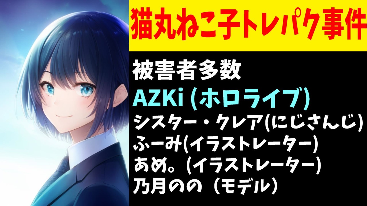 2024年1月6日、猫丸ねこ子というイラストレーターに対し、他の複数のイラストレーターから盗用が指摘され、猫丸氏のイラストを配信サムネイルに使用していたホロライブのAZKIさんはサムネイルを差し替え関係者に謝罪されました。<br><br>引用<br><a href="https://twitter.com/nekomarunekoko/status/1736040036754501641" target="_blank" rel="noopener nofollow">https://twitter.com/nekomarunekoko/status/1736040036754501641</a><br><br>Youtube <a href="https://www.youtube.com/@V_Virgin_Mary" target="_blank" rel="noopener nofollow">https://www.youtube.com/@V_Virgin_Mary</a><br>twitter <a href="https://twitter.com/V_Virgin_Mary" target="_blank" rel="noopener nofollow">https://twitter.com/V_Virgin_Mary</a><br><br>使用素材<br>高品質なフリー動画素材 - Pixabay <a href="https://pixabay.com/ja/videos" target="_blank" rel="noopener nofollow">https://pixabay.com/ja/videos</a>