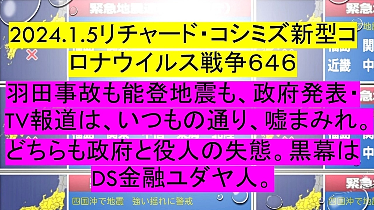 <span style="color: #cc4125;"><strong>「 テーマ : 新型コロナウイルス戦争 646 」</strong></span><br><br><span style="color: #ff0000;"><strong>「『 羽田事故 』も『 能登地震 』も、『 政府発表・TV報道 』は、いつもの通り、『 嘘まみれ 』。<br> どちらも『 政府と役人の失態 』。『 黒幕 』は、『 DEEP STATE金融ユダヤ人 』」</strong></span><br><br><span style="color: #0000ff;"><strong>「『 イベルメクチン・アビガン・その他コロナ対策 』について、ご意見をお寄せ下さい! 」<br> ◐ E-mail : richardkoshimizu@gmail.com</strong></span><br><br> <span style="color: #38761d;"><strong>◐ リチャード・コシミズ『 ニコニコ動画⦅ 全動画 ⦆』公式 動画ギャラリー</strong></span><br> <span style="color: #38761d;"><strong><a href="https://www.nicovideo.jp/user/121957117/video" target="_blank" rel="noopener nofollow">https://www.nicovideo.jp/user/121957117/video</a></strong></span><br><br> <span style="color: #38761d;"><strong>◐ リチャード・コシミズ『 ニコニコ動画⦅ 333 ~ ⦆』公式 動画ギャラリー</strong></span><br> <span style="color: #38761d;"><strong><a href="https://www.nicovideo.jp/user/121028600/video" target="_blank" rel="noopener nofollow">https://www.nicovideo.jp/user/121028600/video</a></strong></span><br><br> <span style="color: #38761d;"><strong>◐ リチャード・コシミズ『 ニコニコ動画⦅ テーマ別 ⦆』公式 動画ギャラリー</strong></span><br> <span style="color: #38761d;"><strong><a href="https://www.nicovideo.jp/user/121192513/video" target="_blank" rel="noopener nofollow">https://www.nicovideo.jp/user/121192513/video</a></strong></span><br><br>