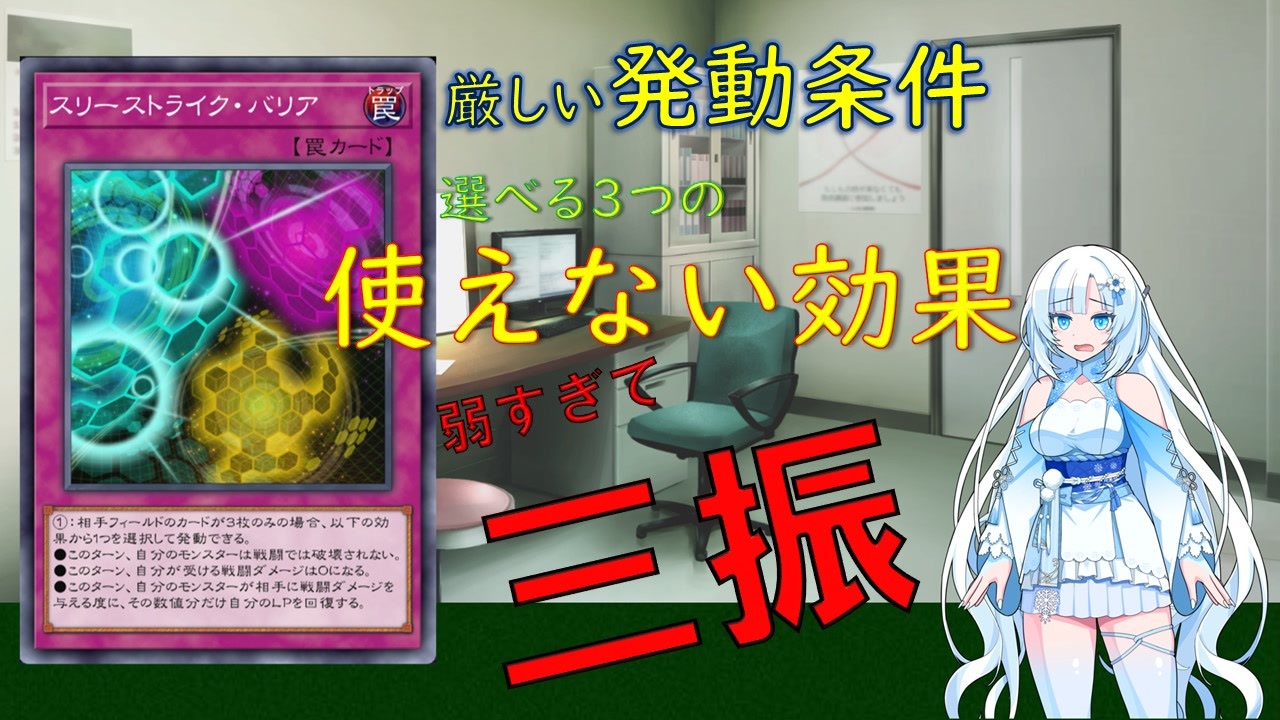 <span style="font-size: 18px;"><strong>このカードが弱い理由は3つある。</strong></span><br><br>●立ち絵<br>moiky様 <a href="https://seiga.nicovideo.jp/seiga/im11047926" target="_blank" rel="noopener">im11047926</a><br><br>●BGM<br>こおろぎ様 <a href="https://commons.nicovideo.jp/works/nc217769" target="_blank" rel="noopener">nc217769</a> <a href="https://commons.nicovideo.jp/works/nc76081" target="_blank" rel="noopener">nc76081</a> <a href="https://commons.nicovideo.jp/works/nc77964" target="_blank" rel="noopener">nc77964</a> <br>こっけ様 <a href="https://commons.nicovideo.jp/works/nc170083" target="_blank" rel="noopener">nc170083</a><br>今川彰人オーケストラ様 <a href="https://dova-s.jp/bgm/play10332.html" target="_blank" rel="noopener nofollow">https://dova-s.jp/bgm/play10332.html</a><br><br>●音声:WhiteCUL<br>VOICEVOX:<a href="https://voicevox.hiroshiba.jp/" target="_blank" rel="noopener nofollow">https://voicevox.hiroshiba.jp/</a><br><br>●使用した動画編集ソフト<br>ゆっくりムービーメーカー4:<a href="https://manjubox.net/ymm4/" target="_blank" rel="noopener nofollow">https://manjubox.net/ymm4/</a>