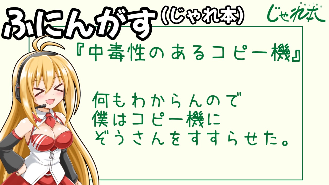 <span style="font-size: 16px;">12/23に行われたじゃれ本で出来た小説をマキさんに朗読してもらいました。</span><br><br><strong>じゃれ本の簡単なルール</strong><br>①タイトルを考える(自由に考えてもいいし、ランダムで命名も出来る)<br>②他の人が考えたタイトルから小説を途中まで書く(140字以内)<br>③また他の人がタイトルと②で作った小説をもとに続きを書く<br>④またまた他の人がタイトルと③で作った小説をもとに続きを書く(②で作った部分は見えない)<br>⑤これを決められた回数やる(今回は全員がやるように7回)<br><br>じゃれ本オンライン↓<br><a href="https://jarebon.com/" target="_blank" rel="noopener nofollow">https://jarebon.com/</a><br><br><strong>支援絵→<a href="https://x.com/BQg7ALwIWNjSdL0/status/1740311824623616472?s=20" target="_blank" rel="noopener nofollow">https://x.com/BQg7ALwIWNjSdL0/status/1740311824623616472?s=20</a></strong><br><br>タイトルの1つにあったガッkoyaさんが書いた小説(本物)の告知動画↓<br><a href="https://www.nicovideo.jp/watch/sm43075869" class="watch">sm43075869</a><br><br>アーカイブ↓(生声注意)<br><a href="https://youtu.be/eIgP4qQ_d2E" target="_blank" rel="noopener nofollow">https://youtu.be/eIgP4qQ_d2E</a><br><br>【参加者(あいうえお順 敬称略)】<br>ガッkoya→<a href="https://www.nicovideo.jp/user/24250283" target="_blank" rel="noopener">user/24250283</a><br>如月ラギ→<a href="https://www.nicovideo.jp/user/814203" target="_blank" rel="noopener">user/814203</a><br>きよたか→<a href="https://www.nicovideo.jp/user/10640801" target="_blank" rel="noopener">user/10640801</a><br>ジロー→<a href="https://www.nicovideo.jp/user/12009913" target="_blank" rel="noopener">user/12009913</a><br>ちくわか→<a href="https://www.nicovideo.jp/user/2580842" target="_blank" rel="noopener">user/2580842</a><br>なりす→<a href="https://www.nicovideo.jp/user/28505319" target="_blank" rel="noopener">user/28505319</a><br>妙楽→<a href="https://www.nicovideo.jp/user/3097821" target="_blank" rel="noopener">user/3097821</a><br />-----------------------------------------------------------<br>part1集→<a href="https://www.nicovideo.jp/mylist/70838418" target="_blank" rel="noopener">mylist/70838418</a><br><br><span style="font-size: 10px;">twitter→<a href="https://twitter.com/tlozoote" target="_blank" rel="noopener nofollow">https://twitter.com/tlozoote</a><br>youtube→<a href="https://www.youtube.com/user/tlozoote" target="_blank" rel="noopener nofollow">https://www.youtube.com/user/tlozoote</a></span>