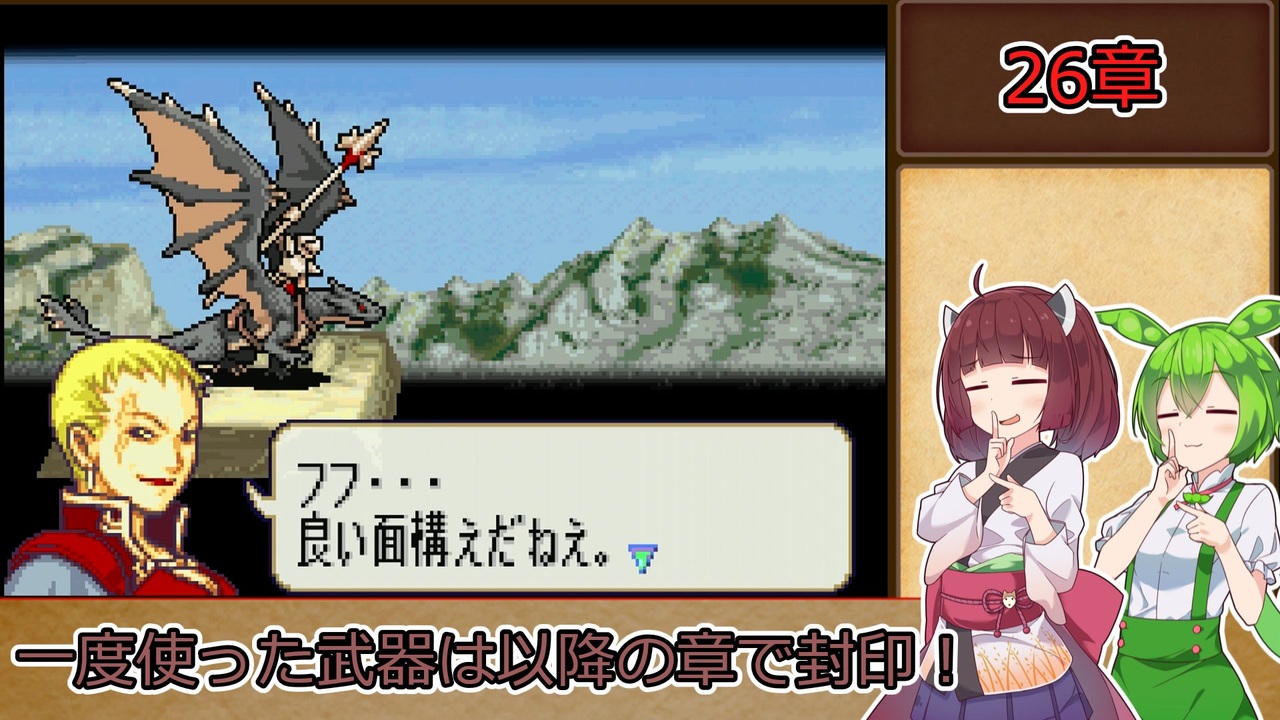 <span style="color: #85200c; font-size: 24px;"><strong><i>だから、睡眠不足を侮ってはいけなかったんですね</i></strong></span><br><br><strong>ルール1:一度使用した武器種は、以降の章で使用する事を禁止する。<br>ルール2:武器の使用の定義は『その武器を装備した状態で敵との戦闘が発生したタイミング』『その武器を売却して換金した場合』杖の場合は『対象に対して使用した時点(命中の可否は問わない)』とする。</strong><br><span style="color: #ff0000;"><strong>※同盟軍、演出による戦闘イベントでは使用した判定にはならないこととする。</strong></span><br><strong>ルール3:難易度はリン編ハード→ヘクトル編ハードとする。<br>ルール4:序章から終章まで外伝、異伝を含む全ての章を攻略し、仲間に出来るユニットは全員加入させ、生存させる。(序章と1章のみ同一の章として扱う)</strong><br><span style="color: #ff0000; font-size: 18px;"><strong>※バグ技禁止</strong></span><br><br>本動画のシリーズリスト【<a href="https://www.nicovideo.jp/series/406473" target="_blank" rel="noopener">series/406473</a>】<br>前作の同縛りプレイ【<a href="https://www.nicovideo.jp/series/316824" target="_blank" rel="noopener">series/316824</a>】<br>前:【<a href="https://www.nicovideo.jp/watch/sm43245135" class="watch">sm43245135</a>】次:【<a href="https://www.nicovideo.jp/watch/sm43298297" class="watch">sm43298297</a>】<br><br><strong>使用したソフト</strong><br>VOICEROID+東北きりたんEX<br>VOICEPEAK 東北きりたん<br>VOICEPEAK ずんだもん<br><strong>お借りした素材</strong><br>ニコニコモンズの皆様(コンテンツツリー参照)<br><br><a target="_blank" href="https://qa.nicovideo.jp/faq/show/19424?site_domain=default" style="font-size: 13px;color: #657586; text-decoration: underline; line-height: 1.4">この動画は投稿者によって修正されました</a>