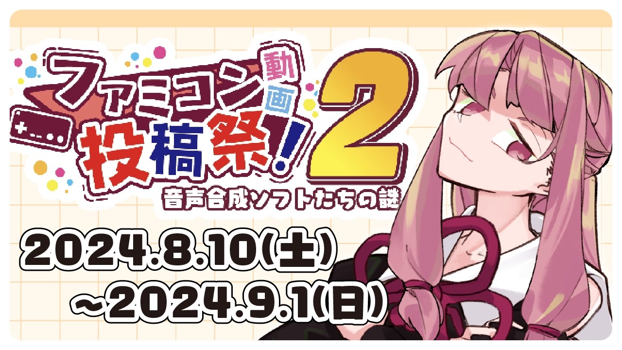 <span style="font-size: 18px;"><strong>※本祭は終了しました!<br>沢山のご参加ありがとうございました!</strong></span><br><br><span style="color: #ff0000; font-size: 24px;"><strong>新しい開催期間は8/10〜9/1になります。</strong></span><br><strong>※サイバー攻撃により開催延期になった為</strong><br><br><span style="font-size: 18px;"><strong>今年もファミリーコンピュータをテーマに盛り上がろう!</strong></span><br>*詳細はこちら!(Googleドキュメント)<br>→<a href="https://docs.google.com/document/d/1-TA4212mURcnobk2FkYufy5jNm3aEL1M_HI1TuWBMIQ/edit?usp=sharing" target="_blank" rel="noopener nofollow">https://docs.google.com/document/d/1-TA4212mURcnobk2FkYufy5jNm3aEL1M_HI1TuWBMIQ/edit?usp=sharing</a><br><br>--------------------------------------------<br><br><span style="font-size: 16px;"><strong>【開催期間】</strong></span>2024年8月10日(土)0:00〜9月1日(日)23:59<br><span style="font-size: 16px;"><strong>【参加タグ】</strong></span>ファミコン動画投稿祭2 ※<strong><u>タグロックをお願いします!</u></strong><br><span style="font-size: 16px;"><strong>【ロゴ】</strong></span><strong>【<a href="https://seiga.nicovideo.jp/seiga/im11352027" target="_blank" rel="noopener">im11352027</a>】</strong><br><br>--------------------------------------------<br><br>Twitter→<a href="https://twitter.com/hinaume014158n" target="_blank" rel="noopener nofollow">https://twitter.com/hinaume014158n</a><br /><br>---------------------------------------------------------<br><span style="color: #ff9900; font-size: 16px;"><strong>*VOCALOID6 AI 紲星あかり 公式デモソング 恋星キャラメリゼ</strong></span><br><span style="color: #434343;">動画担当しました!よろしくお願いします!</span><span style="color: #434343;"><strong>→</strong></span><span style="color: #ff9900;"><strong>【<a href="https://www.nicovideo.jp/watch/sm45034426" class="watch">sm45034426</a>】</strong></span><br><br><span style="color: #ff0000; font-size: 16px;"><strong>*ファミコン動画投稿祭4開催予定!!</strong></span><br>詳細はこちらから→<strong>【<a href="https://www.nicovideo.jp/watch/sm45837591" class="watch">sm45837591</a>】</strong><br>