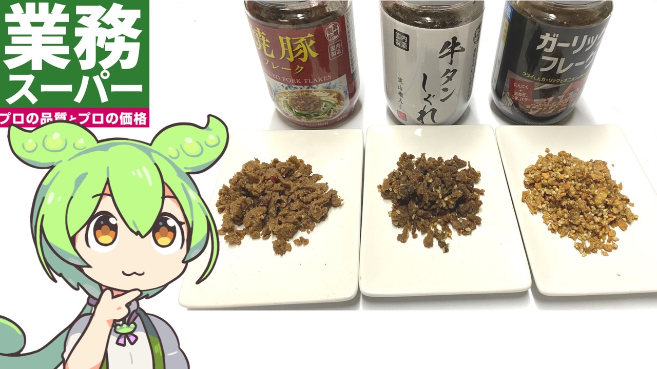 業務スーパーの焼き豚フレーク、牛タンしぐれ、ガーリックフレークです。<br><br><br><br>【関連動画】<br>業務スーパーの「レトルトカレー(3種)」<br><a href="https://www.nicovideo.jp/watch/sm42844860" target="_blank" rel="noopener nofollow">https://www.nicovideo.jp/watch/sm42844860</a><br>業務スーパーの「ずんだもち」<br><a href="https://www.nicovideo.jp/watch/sm42642666" target="_blank" rel="noopener nofollow">https://www.nicovideo.jp/watch/sm42642666</a><br><br><br>【参考】<br>焼豚フレーク(業務スーパー)<br><a href="https://www.gyomusuper.jp/product/detail.php?go_id=2963" target="_blank" rel="noopener nofollow">https://www.gyomusuper.jp/product/detail.php?go_id=2963</a><br>牛タンしぐれ(実山椒入り)(業務スーパー)<br><a href="https://www.gyomusuper.jp/product/detail.php?go_id=6571" target="_blank" rel="noopener nofollow">https://www.gyomusuper.jp/product/detail.php?go_id=6571</a><br>ガーリックフレーク(業務スーパー)<br><a href="https://www.gyomusuper.jp/product/detail.php?go_id=7036" target="_blank" rel="noopener nofollow">https://www.gyomusuper.jp/product/detail.php?go_id=7036</a><br>スポンサー・文化活動(アイリスオーヤマ)<br><a href="https://www.irisohyama.co.jp/company/socialactivity/sponsor/" target="_blank" rel="noopener nofollow">https://www.irisohyama.co.jp/company/socialactivity/sponsor/</a><br>「仙台市民は牛タンを食べないって本当?」アーケードで231人に聞いてみた(だてらぼ)<br><a href="https://datelabo.com/article/gyutan-questionnaire" target="_blank" rel="noopener nofollow">https://datelabo.com/article/gyutan-questionnaire</a><br>「仙台人は牛タンを食べない」その理由は?(Jタウンネット)<br><a href="https://j-town.net/2016/06/26228130.html?p=all" target="_blank" rel="noopener nofollow">https://j-town.net/2016/06/26228130.html?p=all</a><br><br><br>【使用した素材】(※敬称略)<br>(合成音声)VOICEVOX/ずんだもん/四国めたん<br><a href="https://voicevox.hiroshiba.jp/" target="_blank" rel="noopener nofollow">https://voicevox.hiroshiba.jp/</a><br>(立ち絵)坂本アヒル<br><a href="https://seiga.nicovideo.jp/seiga/im10788496" target="_blank" rel="noopener">im10788496</a>/<a href="https://seiga.nicovideo.jp/seiga/im10791276" target="_blank" rel="noopener">im10791276</a><br>(楽曲)甘茶の音楽工房/「楽しい麦畑」「フルーツパフェ」「お城の舞踏会」<br><a href="https://amachamusic.chagasi.com/" target="_blank" rel="noopener nofollow">https://amachamusic.chagasi.com/</a>