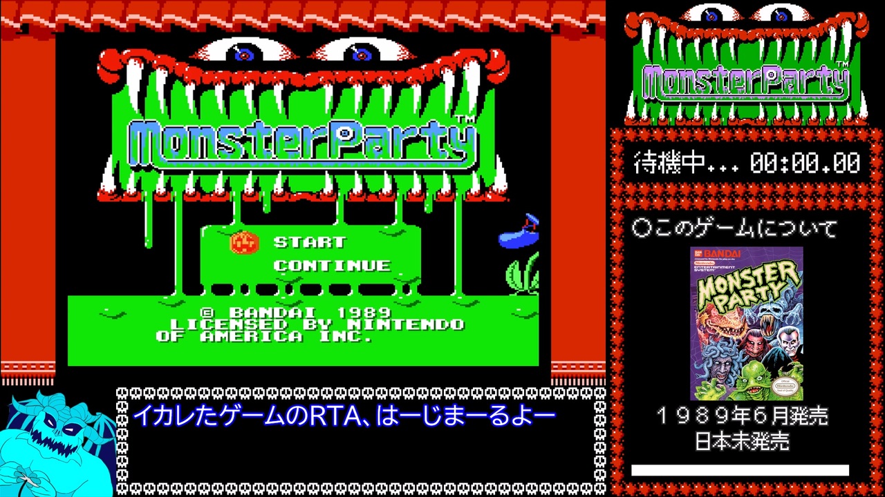 (海外版ファミコンソフトのRTAは)初投稿です。<br>⚠<span style="color: #cc0000;">このゲームには奇妙なシーンやグロテスクな表現が含まれています</span>⚠<br><br>●計測区間<br>ラウンド1開始~ラスボスを倒すまで<br><br>●使用した機種<br>ニューファミコン&純正コントローラー<br><br>タイマーのみ版:<a href="https://youtu.be/EbM-j7UGdW4" target="_blank" rel="noopener nofollow">https://youtu.be/EbM-j7UGdW4</a><br>他のRTA動画:<a href="https://www.nicovideo.jp/mylist/72204350" target="_blank" rel="noopener">mylist/72204350</a><br>speedrun.com:<a href="https://www.speedrun.com/monster_party" target="_blank" rel="noopener nofollow">https://www.speedrun.com/monster_party</a><br><br><br /><br><u>****宣伝領域****</u><br><span style="color: #9900ff;">◯Twitch:たまにゆっくり音声で配信してます。見てネ!</span><br>→ <a href="https://www.twitch.tv/chari_demon" target="_blank" rel="noopener nofollow">https://www.twitch.tv/chari_demon</a><br><span style="color: #0000ff;">◯Twitter:たまに役に立たないことをつぶやく場所。見なくてイイです!</span><br>→ <a href="https://twitter.com/MatChariot" target="_blank" rel="noopener nofollow">https://twitter.com/MatChariot</a>