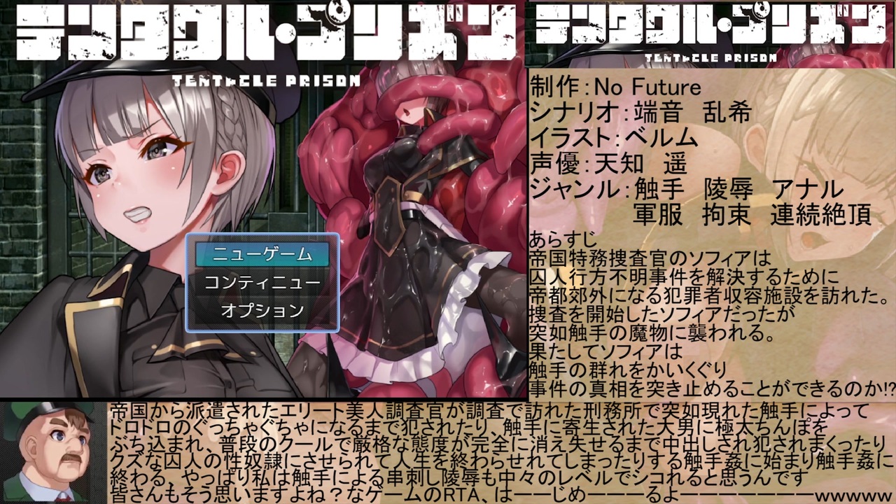<br><span style="color: #ff00ff; font-size: 18px;">触手姦メインのエロゲRTAを走るのは初めてなので、初投稿です。</span><br><br><span style="color: #ff0000; font-size: 24px;"><strong>私はこういう硬派な正義のヒロインが<br>どろどろのぐちゃぐちゃに犯される展開も大好物なのであります!!!!!</strong></span><br><br><br><br><span style="font-size: 18px;">いいねコメ:本日の短歌</span><br><br><br>【No Future】様制作<br>「テンタクル・プリズン」のSランククリア(ラスボス撃破)までのRTAを走らせて頂きました!<br><br><br>■あらすじ<br>帝国特務捜査官のソフィアは、囚人行方不明事件を解決するために、帝都郊外になる犯罪者収容施設を訪れた。<br>捜査を開始したソフィアだったが、突如触手の魔物に襲われる。<br>果たしてソフィアは、触手の群れをかいくぐり、事件の真相を突き止めることができるのか!?<br><br><br>過去のエロゲRTA&エロゲ実況動画タチ→<a href="https://www.nicovideo.jp/mylist/72392739" target="_blank" rel="noopener">mylist/72392739</a>