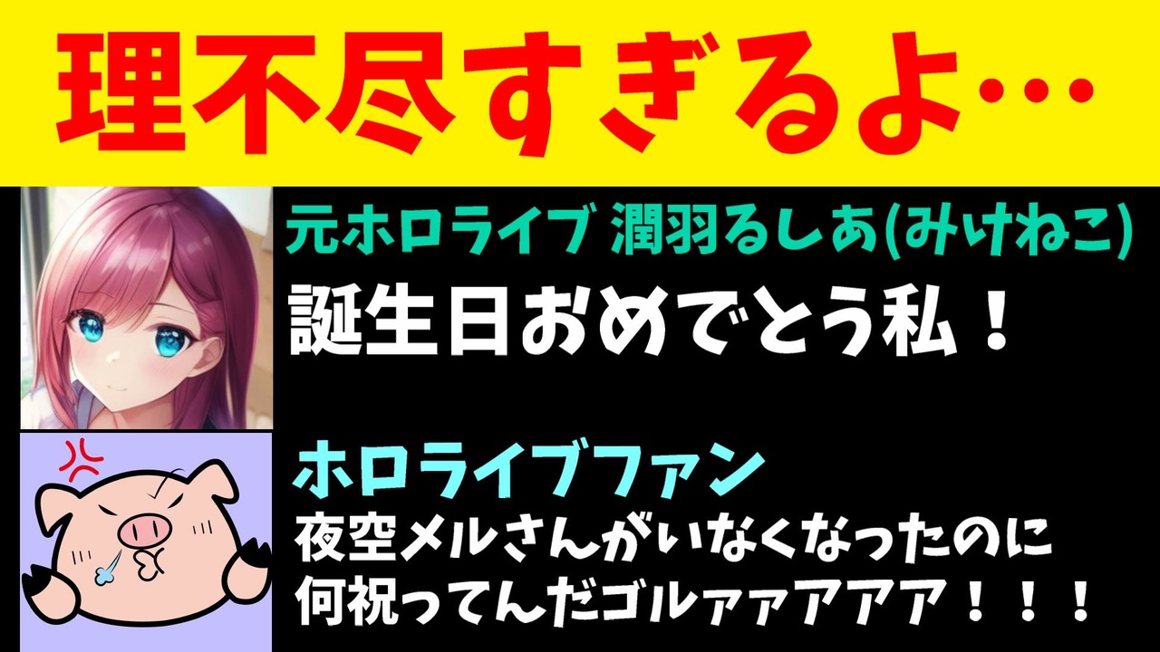 2024年1月18日、元ホロライブの「潤羽るしあ」こと「みけねこ」さんが自身の誕生日を祝う投稿をされたのですが、何故かとあるホロライブ夜空メルファンが激怒し話題になっています。<br><br>引用<br><a href="https://twitter.com/Inosa0810R/status/1747668230263759271" target="_blank" rel="noopener nofollow">https://twitter.com/Inosa0810R/status/1747668230263759271</a><br><br>Youtube <a href="https://www.youtube.com/@V_Virgin_Mary" target="_blank" rel="noopener nofollow">https://www.youtube.com/@V_Virgin_Mary</a><br>twitter <a href="https://twitter.com/V_Virgin_Mary" target="_blank" rel="noopener nofollow">https://twitter.com/V_Virgin_Mary</a><br><br>使用素材<br>高品質なフリー動画素材 - Pixabay <a href="https://pixabay.com/ja/videos" target="_blank" rel="noopener nofollow">https://pixabay.com/ja/videos</a>