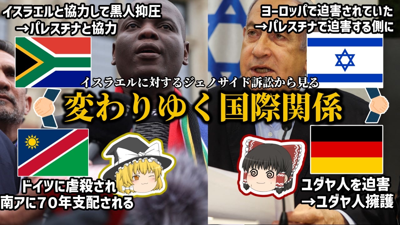<span style="font-size: 18px;">時間の経過とともに、人の在り方というのは変わっていくものです。</span><br><span style="font-size: 16px;">そしてそれは</span><span style="font-size: 16px;"><strong>国</strong></span><span style="font-size: 16px;">も同じ。</span><br><br>冷戦期にイスラエルと協力し、アパルトヘイトによって<br><strong>多数派の黒人を抑圧していた白人政権下の南アフリカ</strong>。<br>ヨーロッパで迫害を受け逃れた新天地パレスチナで、<br>次第にパレスチナに住んでいた<strong>アラブ人を迫害する側に回ったイスラエル</strong>。<br>植民してきたドイツ人に虐殺を受け、後にアパルトヘイト体制の南アフリカに70年支配され、1990年にようやく独立し、<strong>それ以来南ア批判に回ってきたナミビア</strong>。<br>ナチス政権期にユダヤ人を迫害し、国外追放に追い込んだものの、<br><strong>敗戦後ユダヤ人擁護に回り続けるドイツ</strong>。<br><br>今回はそんな国々の変わりゆく様を、南アのイスラエルに対するジェノサイド訴訟から見てみました<br><br>◆マイリスト→<a href="https://www.nicovideo.jp/mylist/73354161" target="_blank" rel="noopener nofollow">https://www.nicovideo.jp/mylist/73354161</a><br>◆アフリカの情報を上げてるうぷ主のTwitter→<a href="https://twitter.com/AfrikaanerMaris" target="_blank" rel="noopener nofollow">https://twitter.com/AfrikaanerMaris</a><br><br>いいねくれるとうれしいです<br>いっぱいコメントしてくれるとうぷ主が喜びます。<br>