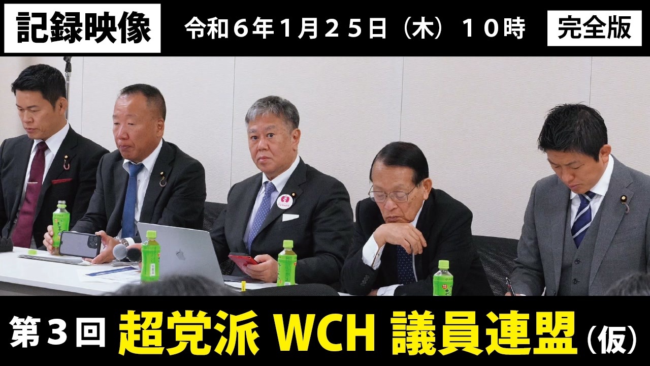 令和6年1月25日 超党派WCH議員連盟(仮)<br><br>この動画は許可を得たうえで投稿者が現地で撮影し、編集し公開しています。<br><br>【高画質版はこちら】<br><a href="https://nicochannel.jp/fujie/video/smPSHMJd56WGq93bSqZeGFuj" target="_blank" rel="noopener nofollow">https://nicochannel.jp/fujie/video/smPSHMJd56WGq93bSqZeGFuj</a><br>(ニコニコチャンネル+)<br><br>―――――――――――――――――――――――――――――――<br><br>❑「世界を欺いた〇〇〇〇〇〇〇」(宝島社新書)<br><a href="https://amzn.to/3ymDfgr" target="_blank" rel="noopener nofollow">https://amzn.to/3ymDfgr</a><br>鳥集徹(著) 闇のダディ(著) 藤江成光(著)←私<br><br>―――――――――――――――――――――――――――――――<br><br>❑藤江の「真の」日本人増加計画(ニコニコチャンネル+)<br><a href="https://nicochannel.jp/fujie/" target="_blank" rel="noopener nofollow">https://nicochannel.jp/fujie/</a><br>※毎月第3土曜日の夜、定例ライブ配信!<br><br><br>❏藤江の活動を支援していただける方向け<br>【藤江支援口座】のご案内<br>住信SBIネット銀行 ミカン支店(店番号103)<br>口座番号 3107694<br>口座名義 フジエ マサミツ<br><br>――――――――――――――――――――――――――――――<br><br>日本の人口増加を目指す男、藤江です!【メインチャンネル】<br><a href="https://www.youtube.com/c/JINKOUZOUKA/" target="_blank" rel="noopener nofollow">https://www.youtube.com/c/JINKOUZOUKA/</a><br><br>地域と日本の存続のためニ!【藤江2ndチャンネル】<br><a href="https://www.youtube.com/channel/UCfBh4rv5UT7D-qR6KsoZrsA" target="_blank" rel="noopener nofollow">https://www.youtube.com/channel/UCfBh4rv5UT7D-qR6KsoZrsA</a><br><br>今こそ!三千年の底力【藤江3rdチャンネル】<br><a href="https://www.youtube.com/channel/UC5Yrsm8-X8nZj4uKgvE7CBw" target="_blank" rel="noopener nofollow">https://www.youtube.com/channel/UC5Yrsm8-X8nZj4uKgvE7CBw</a><br><br>四海兄弟【藤江4thチャンネル】<br><a href="https://www.youtube.com/channel/UCiyJNO57quj80Ysy7nOABvA" target="_blank" rel="noopener nofollow">https://www.youtube.com/channel/UCiyJNO57quj80Ysy7nOABvA</a><br><br>五穀豊穣【藤江5thチャンネル】<br><a href="https://www.youtube.com/channel/UCptMJCoKYghfew5tDzoEqHQ" target="_blank" rel="noopener nofollow">https://www.youtube.com/channel/UCptMJCoKYghfew5tDzoEqHQ</a><br><br>六根清浄【藤江6thチャンネル】<br><a href="https://www.youtube.com/@FUJIE6th" target="_blank" rel="noopener nofollow">https://www.youtube.com/@FUJIE6th</a><br><br>六根清浄【藤江7thチャンネル】<br><a href="https://www.youtube.com/@fujie7th" target="_blank" rel="noopener nofollow">https://www.youtube.com/@fujie7th</a><br><br>藤江のX(Twitter)<br><a href="https://twitter.com/JINKOUZOUKA_jp" target="_blank" rel="noopener nofollow">https://twitter.com/JINKOUZOUKA_jp</a>