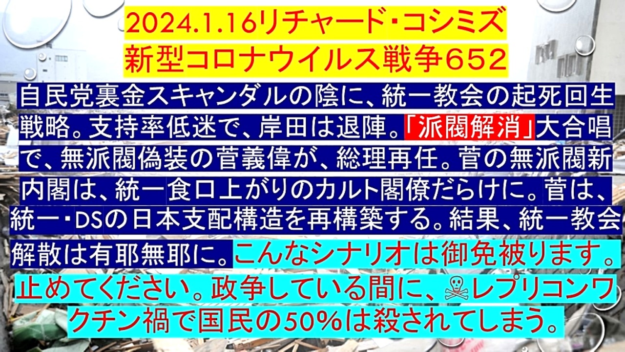 <span style="color: #cc4125;"><strong>「 テーマ : 新型コロナウイルス戦争 652 」</strong></span><br><br><span style="color: #ff0000;"><strong>「『 自民党裏金スキャンダル 』の陰に、『 統一教会の起死回生戦略 』。<br> 『 支持率低迷 』で、『 岸田文雄 』は退陣。<br> 『 派閥解消 』大合唱で、『 無派閥偽装の菅義偉 』が、『 総理再任 』。<br> 『 菅の無派閥新内閣 』は、『 統一食口 』上がりの『 カルト閣僚 』だらけに。<br> 菅は、『 統一教会・DEEP STATE 』の『 日本支配構造を再構築 』する。<br> 結果、『 統一教会解散は有耶無耶に 』。こんな『 シナリオ 』は御免被ります。止めてください。<br> 政争している間に、『 ☠レプリコンワクチン禍 』で『 国民の50% 』は殺されてしまう 」</strong></span><br><br> <span style="color: #38761d;"><strong>◐ リチャード・コシミズ・チャンネル『⦅ ニコニコ チャンネル ⦆』</strong></span><br> <span style="color: #38761d;"><strong><a href="https://ch.nicovideo.jp/richardkoshimizu" target="_blank" rel="noopener nofollow">https://ch.nicovideo.jp/richardkoshimizu</a><br><br> ◐ リチャード・コシミズ『 ニコニコ生放送⦅ LIVE ⦆』</strong></span><br> <span style="color: #38761d;"><strong><a href="https://www.nicovideo.jp/user/120930363/live_programs" target="_blank" rel="noopener nofollow">https://www.nicovideo.jp/user/120930363/live_programs</a><br><br> ◐ リチャード・コシミズ『 Rumble 』公式 動画ギャラリー</strong></span><br> <span style="color: #38761d;"><strong><a href="https://rumble.com/user/richardkoshimizu" target="_blank" rel="noopener nofollow">https://rumble.com/user/richardkoshimizu</a></strong></span><br><br> <span style="color: #38761d;"><strong>◐ リチャード・コシミズ『 ニコニコ動画⦅ 全動画 ⦆』公式 動画ギャラリー</strong></span><br> <span style="color: #38761d;"><strong><a href="https://www.nicovideo.jp/user/121957117/video" target="_blank" rel="noopener nofollow">https://www.nicovideo.jp/user/121957117/video</a></strong></span><br><br><br>