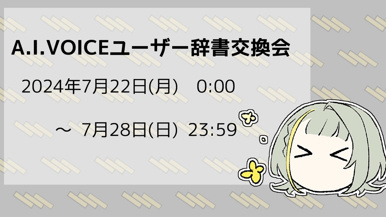 ソロ実況祭第3回と第4回(予定)の合間のミニ企画を立てました。<br><br>◆概要<br>A.I.VOICE/VOICEROID2の辞書をみんなで作って共有しようという企画(投稿祭)です<br><br>◆参加方法<br>① A.I.VOICEでユーザー辞書を作成して公開<br>② 作成した辞書の紹介動画をニコニコ動画に投稿<br> 参加用タグ「A.I.VOICEユーザー辞書交換会」<br>※A.I.VOICEユーザーは動画投稿者だけではないので①のみでの参加も可としています。<br>①のみの場合はXにて「#A.I.VOICEユーザー辞書交換会」のハッシュタグを付けて、辞書のダウンロードリンクをポストしてください<br><span style="font-size: 18px;"><strong>→ハッシュタグを「#AIVOICEユーザー辞書交換会」に変更いたします</strong></span><br><br>◆日時<br>① ユーザー辞書の公開は本日~動画投稿期間終了まで<br>② 動画投稿期間は<br> <s>2024年7月22日(月) 0:00~7月28日(日) 23:59</s><br><span style="font-size: 18px;"><strong> 2024年8月19日(月) 0:00~8月25日(日) 23:59</strong></span><br><br>◆辞書のルール<br>・A.I.VOICE用辞書は必須、VOICEROID2用辞書はオプションとします<br>・必ずエーアイ社が定める共有物利用条件を含めたテキストファイルを添付すること<br> 共有物利用条件についてはA.I.VOICE FAQ[ <a href="https://aivoice.jp/faq/" target="_blank" rel="noopener nofollow">https://aivoice.jp/faq/</a> ] 使い方に関する質問を参照<br><br><a href="#" class="seekTime" data-seekTime="0:00" onclick="seekNicoPlayer('#0:00'); return false;">#0:00</a> 導入<br><a href="#" class="seekTime" data-seekTime="1:01" onclick="seekNicoPlayer('#1:01'); return false;">#1:01</a> 参加方法<br><a href="#" class="seekTime" data-seekTime="1:54" onclick="seekNicoPlayer('#1:54'); return false;">#1:54</a> 辞書ファイルについての注意事項<br><a href="#" class="seekTime" data-seekTime="2:38" onclick="seekNicoPlayer('#2:38'); return false;">#2:38</a> 参加作品について(主催者による紹介)<br><a href="#" class="seekTime" data-seekTime="3:04" onclick="seekNicoPlayer('#3:04'); return false;">#3:04</a> 想定Q&A<br><a href="#" class="seekTime" data-seekTime="6:00" onclick="seekNicoPlayer('#6:00'); return false;">#6:00</a> 辞書ファイル作成についてのTIPS<br><a href="#" class="seekTime" data-seekTime="7:30" onclick="seekNicoPlayer('#7:30'); return false;">#7:30</a> 締め<br><br>【参考】<br>過去のユーザー辞書配布例<br><a href="https://www.nicovideo.jp/tag/A.I.VOICE%E8%BE%9E%E6%9B%B8%E9%85%8D%E5%B8%83" target="_blank" rel="noopener nofollow">https://www.nicovideo.jp/tag/A.I.VOICE%E8%BE%9E%E6%9B%B8%E9%85%8D%E5%B8%83</a><br>おすすめツール<br>KotonoAssist <a href="https://www.nicovideo.jp/watch/sm31823384" class="watch">sm31823384</a><br><br>【連絡先】<br>X: <a href="https://x.com/_nenashi_kusa" target="_blank" rel="noopener nofollow">https://x.com/_nenashi_kusa</a><br>Discord: nenashi<br><br><br><a target="_blank" href="https://qa.nicovideo.jp/faq/show/19424?site_domain=default" style="font-size: 13px;color: #657586; text-decoration: underline; line-height: 1.4">この動画は投稿者によって修正されました</a>