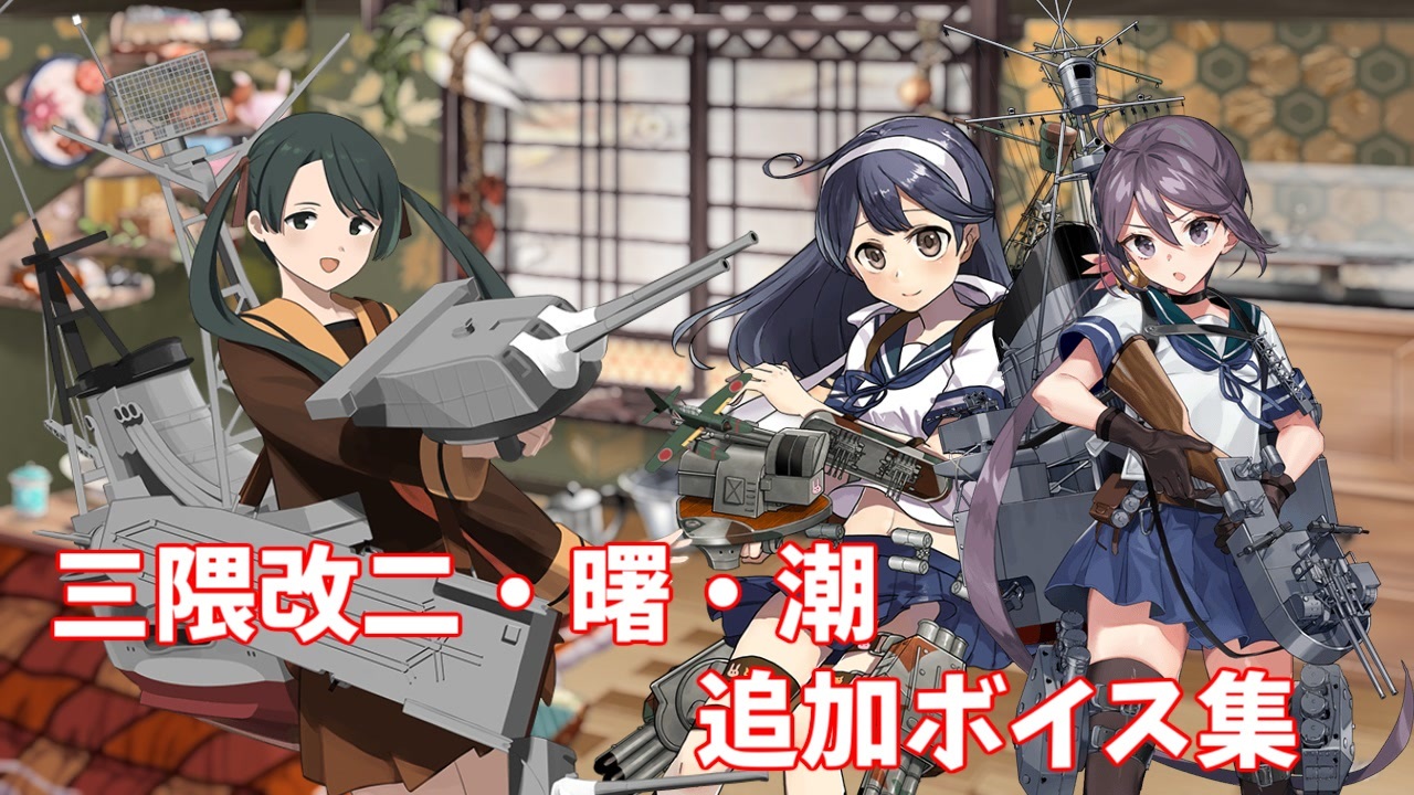 三隈改二・特の追加ボイスと、曙&潮に実装された時報等の追加ボイス集です。<br>動画時間が長くなったので同日実装の節分ボイスは次回の動画に分割しています。<br><br><a href="#" class="seekTime" data-seekTime="00:04" onclick="seekNicoPlayer('#00:04'); return false;">#00:04</a> 三隈改二・特 追加ボイス<br><a href="#" class="seekTime" data-seekTime="01:11" onclick="seekNicoPlayer('#01:11'); return false;">#01:11</a> 曙改二 時報ボイス<br><a href="#" class="seekTime" data-seekTime="07:34" onclick="seekNicoPlayer('#07:34'); return false;">#07:34</a> 潮改二 母港・時報ボイス(節分modeは次の動画に収録)<br><br>【新規絵】<br>(三隈改二 三隈改二特)<br><br>前|2024「新春」ボイス集 (1/1アップデート) <a href="https://www.nicovideo.jp/watch/sm43222686" class="watch">sm43222686</a><br><strong>次|2024「節分」ボイス集 (1/25アップデート②) </strong><a href="https://www.nicovideo.jp/watch/sm43325632" class="watch">sm43325632</a><br><br>艦これ追加ボイス集 マイリスト(<a href="https://www.nicovideo.jp/mylist/40513442" target="_blank" rel="noopener">mylist/40513442</a>)<br>シリーズ(<a href="https://www.nicovideo.jp/series/34200" target="_blank" rel="noopener">series/34200</a>)<br><br>Youtubeでも活動しています。<br>チャンネル <a href="https://www.youtube.com/channel/UCTYYB9O7hiQlH6Ee-Xxlbpg" target="_blank" rel="noopener nofollow">https://www.youtube.com/channel/UCTYYB9O7hiQlH6Ee-Xxlbpg</a>