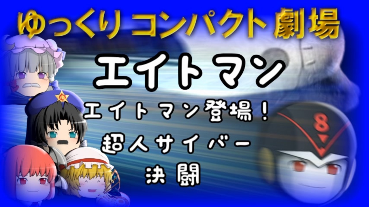 「ゆっくり文庫リスペクト」第十八弾。<br><br>今回は、やりたい部分だけやってしまう「うっかり文庫」として放送。<br>解説も結構あるので「解説動画」なのです。たぶん。<br><br>「エイトマン」は有名漫画、アニメ。<br>当然内容は知っていましたが、私の世代では読んだ事も見た事もありませんでした。<br>そして近年。youtubeの公式チャンネルから期間限定公開。<br>ゆっくり文庫さんのマイブームになっていました。<br>前の「ジャイアントロボ」みたいのが作りたかったので、せっかくなのでコン劇化しました。<br><br><br>・オープニング <a href="#" class="seekTime" data-seekTime="0:20" onclick="seekNicoPlayer('#0:20'); return false;">#0:20</a><br>オープング比較動画:<a href="https://www.nicovideo.jp/watch/sm43329786" class="watch">sm43329786</a><br>・エイトマン登場! <a href="#" class="seekTime" data-seekTime="1:20" onclick="seekNicoPlayer('#1:20'); return false;">#1:20</a><br>・解説1 <a href="#" class="seekTime" data-seekTime="7:54" onclick="seekNicoPlayer('#7:54'); return false;">#7:54</a><br>・超人サイバー <a href="#" class="seekTime" data-seekTime="12:18" onclick="seekNicoPlayer('#12:18'); return false;">#12:18</a><br>・決闘 <a href="#" class="seekTime" data-seekTime="18:01" onclick="seekNicoPlayer('#18:01'); return false;">#18:01</a><br>・解説2 <a href="#" class="seekTime" data-seekTime="24:40" onclick="seekNicoPlayer('#24:40'); return false;">#24:40</a><br><br>【ゆっくり文庫】エイトマン「光線銃レーザー」<br><a href="https://www.nicovideo.jp/watch/sm43470088" class="watch">sm43470088</a><br>【ゆっくり文庫】エイトマン「地球ゼロアワー」<br><a href="https://www.nicovideo.jp/watch/sm43528510" class="watch">sm43528510</a><br>【Tairon Works】エイトマン-誕生篇-【ゆっくり文庫リスペクト】<br><a href="https://www.nicovideo.jp/watch/sm43473764" class="watch">sm43473764</a><br>ゆかりエイトマン もし助けにきたヒーローが強加剤中毒だったら【ソフトウェアトーク劇場】<br><a href="https://www.nicovideo.jp/watch/sm43476798" class="watch">sm43476798</a><br>ゆかりエイトマン2 宿敵サタンの姉妹は「姉妹」じゃなかった!?【ソフトウェアトーク劇場】<br><a href="https://www.nicovideo.jp/watch/sm43551341" class="watch">sm43551341</a><br><br>youtube公式公開エイトマン<br><a href="https://www.youtube.com/watch?v=R-6vKXwHfCY&t=127s" target="_blank" rel="noopener nofollow">https://www.youtube.com/watch?v=R-6vKXwHfCY&t=127s</a><br><br>前⇒<a href="https://www.nicovideo.jp/watch/sm42882721" class="watch">sm42882721</a><br><br>次⇒<a href="https://www.nicovideo.jp/watch/sm43632050" class="watch">sm43632050</a><br><br>mylist⇒<a href="https://www.nicovideo.jp/mylist/67330756" target="_blank" rel="noopener">mylist/67330756</a><br><br />うp主のクリ奨扱いの番組(ギフト)<br>●動画投稿講座(海兵隊式)<br><a href="https://www.nicovideo.jp/watch/sm41183459" class="watch">sm41183459</a><br><br>●ほしいものリスト(同じものでも全然嬉しい)<br><a href="https://www.amazon.co.jp/hz/wishlist/ls/20X2QKDPSW451?ref_=wl_share" target="_blank" rel="noopener nofollow">https://www.amazon.co.jp/hz/wishlist/ls/20X2QKDPSW451?ref_=wl_share</a><br>●匿名で送る方法<br><a href="https://appllio.com/amazon-wish-list" target="_blank" rel="noopener nofollow">https://appllio.com/amazon-wish-list</a><br><br>うp主の動画<br>ゆっくりのワイドショー⇒<a href="https://www.nicovideo.jp/mylist/45200880" target="_blank" rel="noopener">mylist/45200880</a><br>ゆっくりコンパクト劇場⇒<a href="https://www.nicovideo.jp/mylist/67330756" target="_blank" rel="noopener">mylist/67330756</a><br>ゆっくりロードショー⇒<a href="https://www.nicovideo.jp/mylist/51596849" target="_blank" rel="noopener">mylist/51596849</a><br>おもちゃ箱⇒<a href="https://www.nicovideo.jp/series/265908" target="_blank" rel="noopener">series/265908</a><br>ようつべセブンのチャンネル<br><a href="http://www.youtube.com/c/sevenyoutube" target="_blank" rel="noopener nofollow">http://www.youtube.com/c/sevenyoutube</a><br><br>ニコニコ大百科 ゆっくりのワイドショー<br><a href="https://dic.nicovideo.jp/id/5337230" target="_blank" rel="noopener nofollow">https://dic.nicovideo.jp/id/5337230</a><br><br>ニコニコ大百科 ゆっくり文庫リスペクト<br><a href="https://dic.nicovideo.jp/id/5701480" target="_blank" rel="noopener nofollow">https://dic.nicovideo.jp/id/5701480</a>
