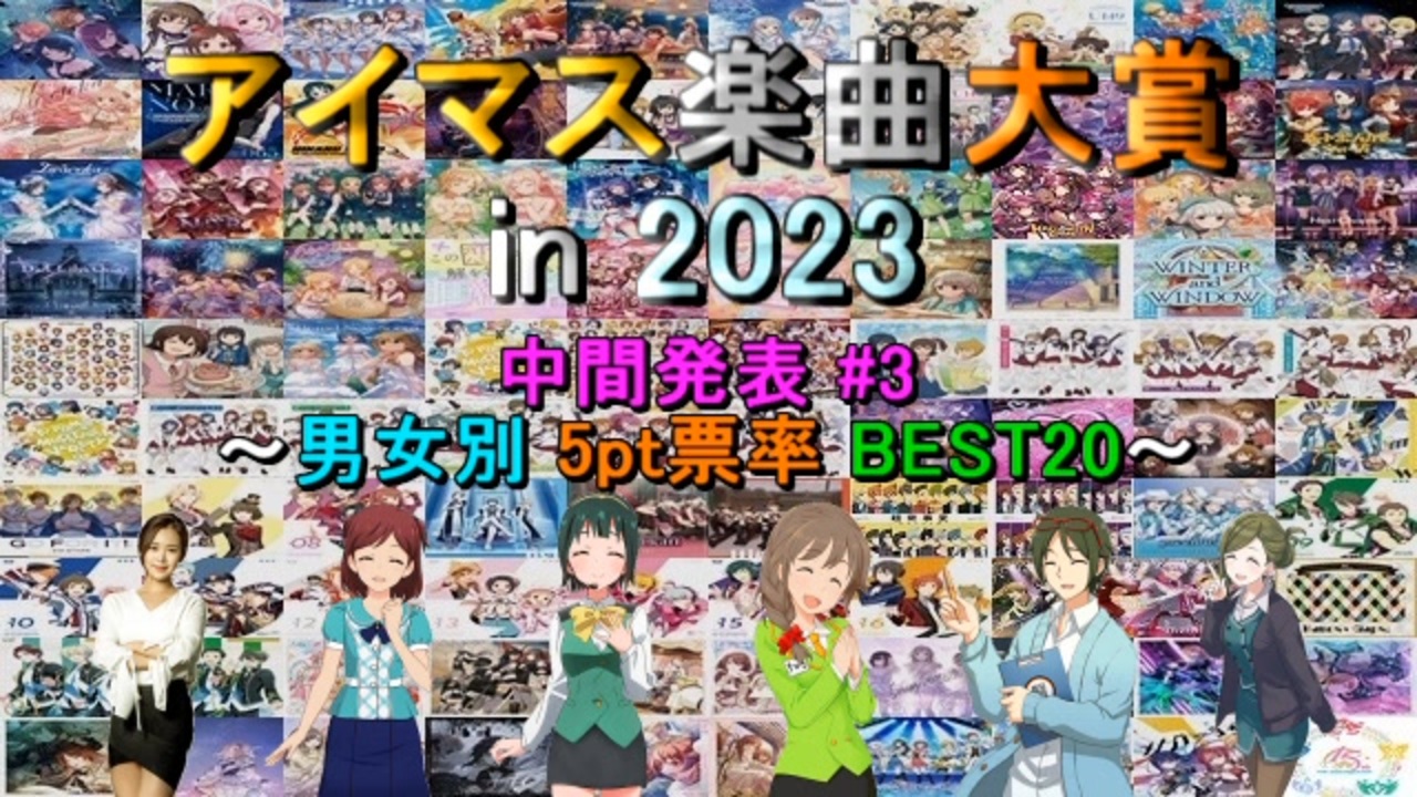 <span style="color: #ff0000;"><strong>2023年にFull音源版が発売 or 配信</strong></span>されたアイマス関連の楽曲<br>(<span style="color: #0000ff;"><strong>計155曲</strong></span>)に対する人気投票企画の中間発表3回目です。<br>参加者<span style="color: #00ff00;"><strong>1500名</strong></span>の時点の結果から、<span style="color: #ff9900;"><strong>各楽曲における5pt票率を<br>男女別に上位20曲</strong></span>ご紹介します。<br><br>※5pt票率=<span style="color: #ff00ff;"><strong>各楽曲の獲得5pt票数</strong></span>÷<span style="color: #00ffff;"><strong>各楽曲の獲得総票数</strong></span><br>※同率の順位の場合は順位右に「<span style="color: #9900ff;"><strong>T</strong></span>」を表示。<br><br><span style="font-size: 16px;"><strong>※最終結果完成しました!⇒<a href="https://www.nicovideo.jp/watch/sm43381652" class="watch">sm43381652</a></strong></span><br><br>○告知動画:<a href="https://www.nicovideo.jp/watch/sm43217650" class="watch">sm43217650</a><br>○中間2回目(楽曲別 分野順位一覧):<a href="https://www.nicovideo.jp/watch/sm43298807" class="watch">sm43298807</a><br><br>●「アイマス楽曲大賞 最終結果まとめ」:<a href="https://www.nicovideo.jp/mylist/70533939" target="_blank" rel="noopener">mylist/70533939</a><br>●『アイマス楽曲ランキングシリーズ』:<a href="https://www.nicovideo.jp/mylist/57911966" target="_blank" rel="noopener">mylist/57911966</a><br>●『THE IDOLM@STER Song Collection』:<a href="https://www.nicovideo.jp/mylist/61493969" target="_blank" rel="noopener">mylist/61493969</a>