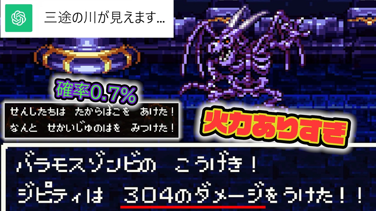 <strong>過去最大被ダメと最大の努力</strong><br><br><span style="color: #ff0000;">~基本ルール~-</span><br>①GPTは勇者を殺す為の行動を取る<br>②GPTは魔法使いのキャラとして作成し、その操作は<br>この全ルールを把握したchatGPTに都度聞いて任せる。<br>③GPTはわざと自殺・MP回復拒否するような行動は取れない<br>④GPTはパーティの1番前か1番後ろに配置させる<br>⑤GPTの持ち物や呪文はGPTの意思でしか移動・使用できない<br>⑥買い物時は全てプレイヤーの自由にできる<br>⑦リセットや、データを消去して1からやり直しても良い<br>⑧経験値を伴わない裏での金稼ぎ作業時のみルール全て例外とする<br><br><span style="color: #0000ff;">~禁じ手~</span><br>①操作キャラでGPTに危害を加える行為(危害=ダメージや悪い状態異常など)<br>※メダパニで混乱したせいで殴る、などは許される<br>②戦闘中にGPTが死んだ際に放置(その次のターン中に蘇生させなければいけない)<br>③戦闘開始or終了時にGPTが死んでいる<br>④GPTのMPが0か1の時にHP回復の選択(蘇生も)を<br>GPT以外のメンバーに対して取る ※宿屋系はOK<br>⑤GPT以外の仲間がマホカンタ状態になる<br>⑥GPTがいない状態で戦闘を開始or続けるor勝利(バシルーラ等でいなくなったら逃げる行動のみ可)<br>⑦商人の特技「あなほり」を使うこと <br>⑧しあわせのくつの使用<br>⑨盗賊が盗んだ道具の使用<br><br><span style="color: #38761d;">勇者が死ぬ or 上記を破る度にGPTに強制リセット。「リセット」をする度にGPTに1pt。<br>50pt貯まったらGPTの勝ち。企画終了。</span><br><br><strong>【次】 下のシリーズから飛んでね<br>【part1】 <a href="https://www.nicovideo.jp/watch/sm42595666" class="watch">sm42595666</a> 【投稿動画まとめ】 <a href="https://www.nicovideo.jp/mylist/32090282" target="_blank" rel="noopener">mylist/32090282</a></strong><br><br><span style="color: red;"><strong>▼投稿者情報▼</strong></span><br>【 Twitter 】 <a href="https://twitter.com/wakou2525" target="_blank" rel="noopener nofollow">https://twitter.com/wakou2525</a><br>【生放送コミュ】 co1668349<br>【意見・連絡先】 wakou2525otayori@yahoo.co.jp