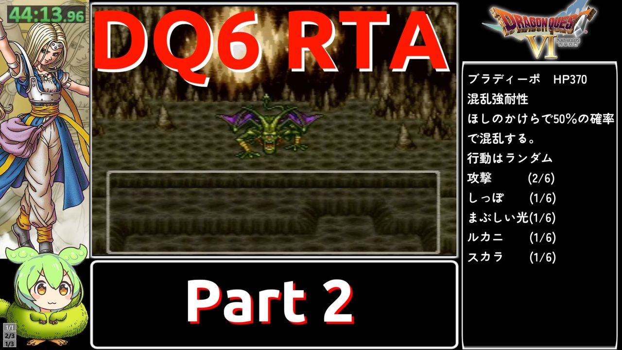 SFC版 DQ6 最速でクリアするぞい。<br>状況再現使います。<br>月2本投稿目標ギリギリ間に合ったな(白目)<br><br>前:<a href="https://www.nicovideo.jp/watch/sm43227218" class="watch">sm43227218</a><br>次:<a href="https://www.nicovideo.jp/watch/sm43485680" class="watch">sm43485680</a><br><br>YouTube版:<a href="https://www.youtube.com/watch?v=HeduGP2MTrA" target="_blank" rel="noopener nofollow">https://www.youtube.com/watch?v=HeduGP2MTrA</a><br>配信アーカイブ:<a href="https://youtube.com/live/Vmky3DXMi7g" target="_blank" rel="noopener nofollow">https://youtube.com/live/Vmky3DXMi7g</a><br><br>チャートはこちら<a href="https://eiki-rta-tas.blogspot.com/2024/01/sfcdq6rta.html" target="_blank" rel="noopener nofollow">https://eiki-rta-tas.blogspot.com/2024/01/sfcdq6rta.html</a><br><br>【TAS】DQ6ダークドレアム撃破END: <a href="https://www.nicovideo.jp/series/350095" target="_blank" rel="noopener nofollow">https://www.nicovideo.jp/series/350095</a><br>Twitter のフォローお願いします!<br><a href="https://twitter.com/eikyudai" target="_blank" rel="noopener nofollow">https://twitter.com/eikyudai</a><br><br>VOICEVOX:ずんだもん<br>ネタバレあり<br>この動画で利用している株式会社スクウェア・エニックスを代表とする共同著作者が権利を所有する著作物及びスギヤマ工房有限会社が権利を所有する楽曲の転載・配布は禁止いたします。<br>© 1995 ARMOR PROJECT/BIRD STUDIO/HEART BEAT/SQUARE ENIX All Rights Reserved.<br>© SUGIYAMA KOBO