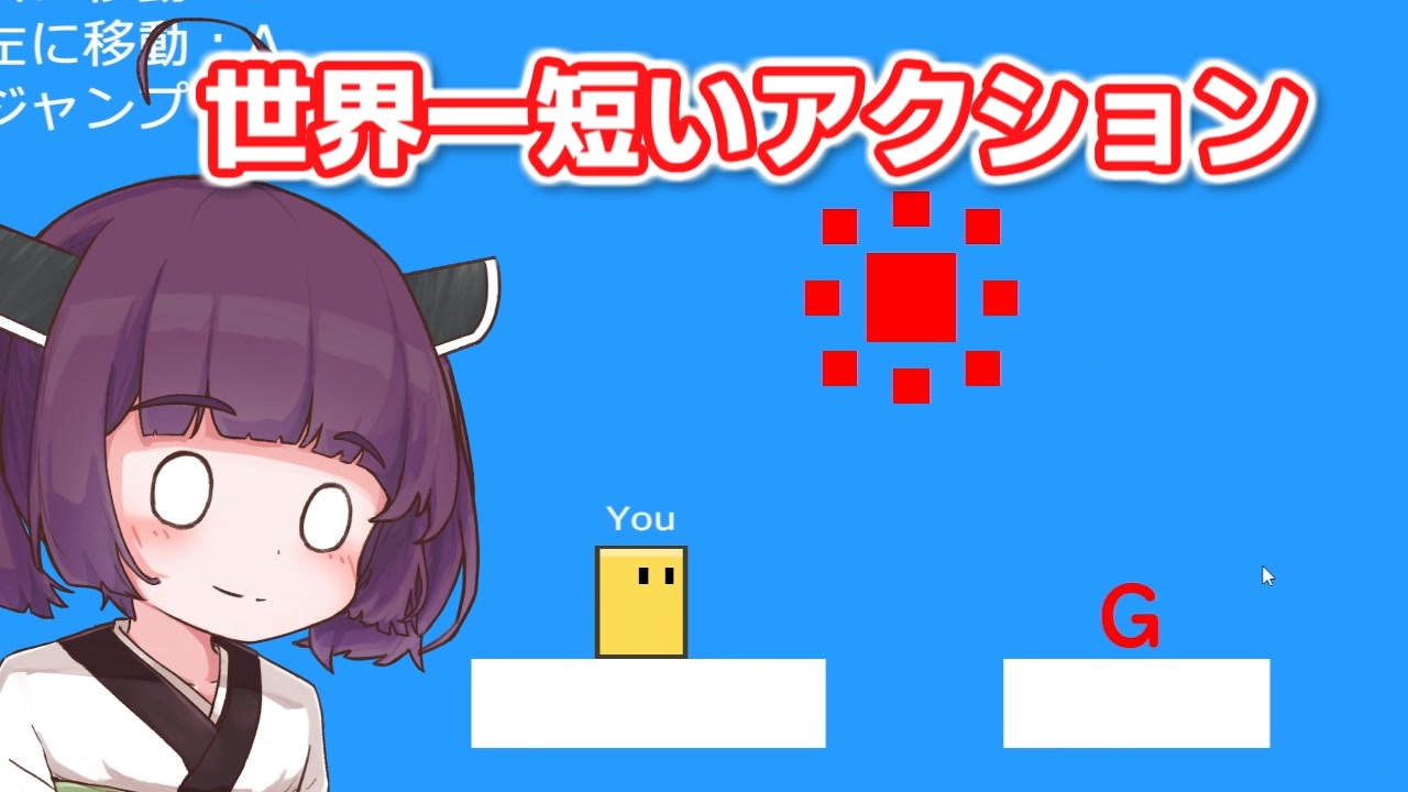 き「てきとーに短いゲームでちゃちゃっと動画作ります」<br>ウ「これだから動画投稿者は」<br><br><br>・立ち絵<br>かみみやさん <a href="https://seiga.nicovideo.jp/seiga/im11304821" target="_blank" rel="noopener nofollow">https://seiga.nicovideo.jp/seiga/im11304821</a><br>セナさん <a href="https://seiga.nicovideo.jp/seiga/im11250805" target="_blank" rel="noopener nofollow">https://seiga.nicovideo.jp/seiga/im11250805</a><br>りょうごさん <a href="https://seiga.nicovideo.jp/seiga/im11119649" target="_blank" rel="noopener nofollow">https://seiga.nicovideo.jp/seiga/im11119649</a><br>こんにゃくねこさん <a href="https://seiga.nicovideo.jp/seiga/im11085860" target="_blank" rel="noopener nofollow">https://seiga.nicovideo.jp/seiga/im11085860</a><br>絃弥さん <a href="https://seiga.nicovideo.jp/seiga/im11135274" target="_blank" rel="noopener nofollow">https://seiga.nicovideo.jp/seiga/im11135274</a><br><br>VOICEPEAK:東北きりたん、音街ウナ、彩澄しゅお、彩澄りりせ、東北ずん子<br><br>世界一短いアクションゲーム - 影老院 <a href="https://unityroom.com/games/shortest_action" target="_blank" rel="noopener nofollow">https://unityroom.com/games/shortest_action</a><br><a href="https://store.steampowered.com/app/2081670/CALAMITY_CREATURES/" target="_blank" rel="noopener nofollow">https://store.steampowered.com/app/2081670/CALAMITY_CREATURES/</a><br />ほかの動画はこちらからどうぞ<br><a href="https://www.nicovideo.jp/user/125432075/series" target="_blank" rel="noopener nofollow">https://www.nicovideo.jp/user/125432075/series</a><br><br><a target="_blank" href="https://qa.nicovideo.jp/faq/show/19424?site_domain=default" style="font-size: 13px;color: #657586; text-decoration: underline; line-height: 1.4">この動画は投稿者によって修正されました</a>