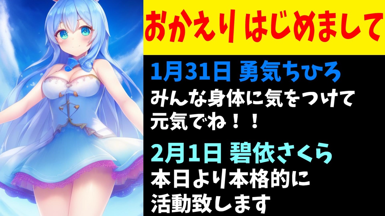 2024年2月1日、にじさんじを1月31日に卒業した「勇気ちひろ」こと「碧依さくら」さんが自身のTwitterアカウントにて本格的な活動開始を宣言し動画を投稿されました。<br><br>引用<br>【ティザー動画】はじめまして【碧依さくら】<br><a href="https://youtu.be/YZLXo1quNRI?si=KnHcvjm3gPjI5gdn" target="_blank" rel="noopener nofollow">https://youtu.be/YZLXo1quNRI?si=KnHcvjm3gPjI5gdn</a><br><a href="https://twitter.com/sakura_aoi_main/status/1752920354992115900" target="_blank" rel="noopener nofollow">https://twitter.com/sakura_aoi_main/status/1752920354992115900</a><br><br>Youtube <a href="https://www.youtube.com/@V_Virgin_Mary" target="_blank" rel="noopener nofollow">https://www.youtube.com/@V_Virgin_Mary</a><br>twitter <a href="https://twitter.com/V_Virgin_Mary" target="_blank" rel="noopener nofollow">https://twitter.com/V_Virgin_Mary</a><br><br>使用素材<br>高品質なフリー動画素材 - Pixabay <a href="https://pixabay.com/ja/videos" target="_blank" rel="noopener nofollow">https://pixabay.com/ja/videos</a>
