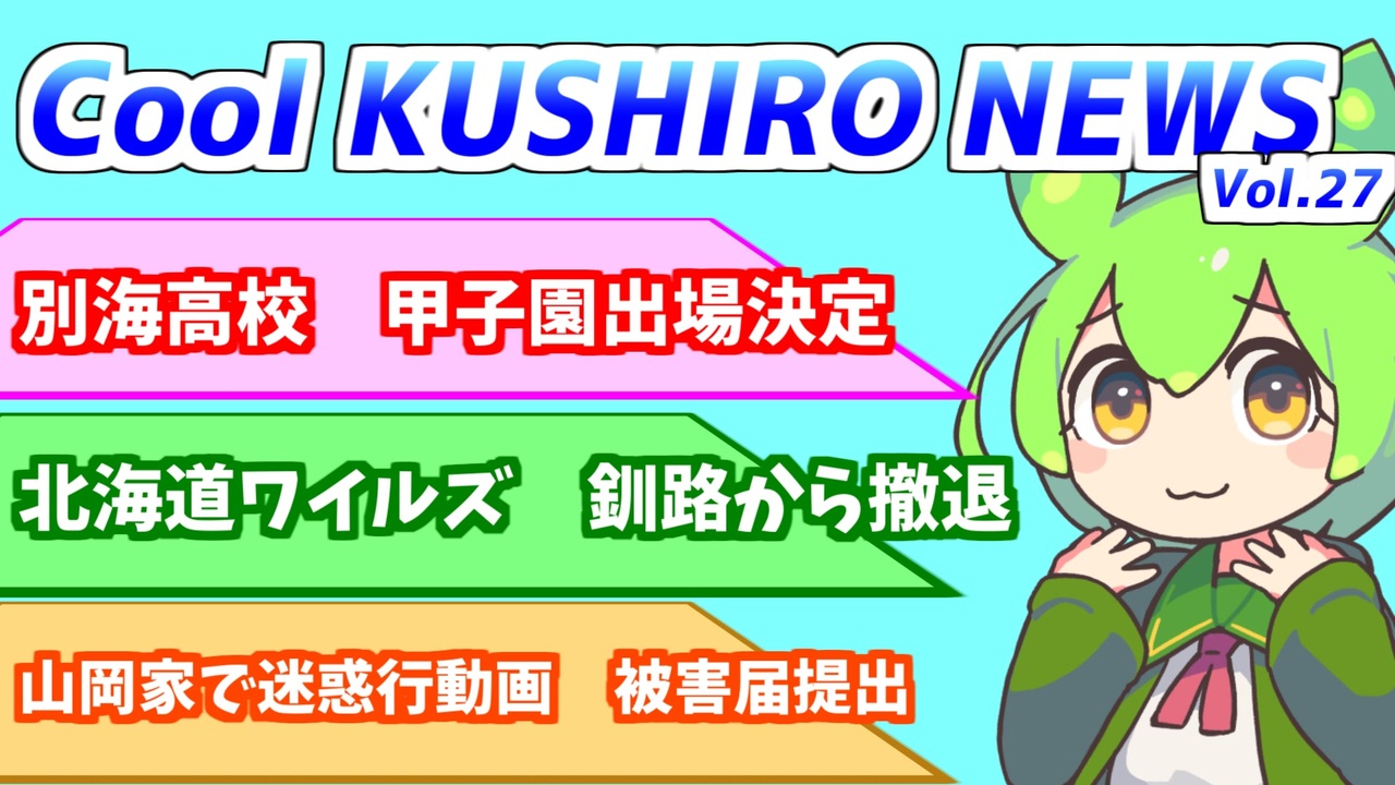 釧路近辺で起こった出来事をなんとなくお伝えするニュース番組です <br><br><br><br>●音声ソフト<br>VOICEVOX:ずんだもん<br>VOICEVOX:四国めたん<br>VOICEVOX:九州そら<br><br /><span style="color: #ff0000; font-size: 24px;"><strong>釧路を紹介するブログ始めました</strong></span>:<a href="https://946de2100.com" target="_blank" rel="noopener nofollow">https://946de2100.com</a><br><br><span style="color: #ff0000; font-size: 16px;"><strong>●おススメ動画:</strong></span><span style="color: #ff0000; font-size: 18px;"><strong>【歴史解説】かつて 釧路を支配していたのは佐賀だった ~釧路元町の始まりと佐野孫右衛門の盛衰~</strong></span><br><br><a href="https://www.nicovideo.jp/watch/sm44267722" class="watch">sm44267722</a><br><br><br><span style="color: #ff0000; font-size: 18px;"><strong>●YouTubeチャンネルも登録よろしくお願いします</strong></span><br><strong>釧路チャンネル <a href="https://www.youtube.com/@znd-kaisetu" target="_blank" rel="noopener nofollow">https://www.youtube.com/@znd-kaisetu</a></strong><br>恋結シラリカソロチャンネル <a href="https://www.youtube.com/@enmusubi-shirarika" target="_blank" rel="noopener nofollow">https://www.youtube.com/@enmusubi-shirarika</a><br><br><br>ほしいものリスト <a href="https://www.amazon.jp/hz/wishlist/ls/2OUUB1JQSRUWG?ref_=wl_share" target="_blank" rel="noopener nofollow">https://www.amazon.jp/hz/wishlist/ls/2OUUB1JQSRUWG?ref_=wl_share</a><br>クリエイターサポート<a href="https://creator-support.nicovideo.jp/registration/116665199" target="_blank" rel="noopener nofollow">https://creator-support.nicovideo.jp/registration/116665199</a>