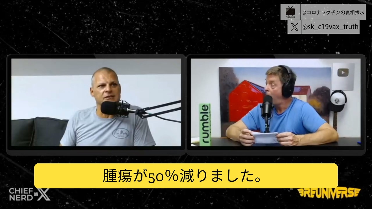 ケビンさん:<br>・手術を受け、15センチの腫瘍を切除。<br>・3年間化学療法受け、臓器が機能停止し始め、化学療法が停められ。ホスピス(終末期医療)を受けた。<br>・癌が寄生虫原因、馬の駆虫薬フェンベンダゾールで癌が治った話を聞いて、最初は笑ってました。<br>・最終的に治療法を受けることを決め、五つの薬(サプリメントも)成分内訳を教えてくれた。<br>・フェンベンダゾール<br>・ククルミン、抗炎症作用と抗酸化作用。<br>・アナトー、ビタミンEの良い部分。<br>・タガメット、有効成分がシメチジン。<br>・活性型ヘキソース相関化合物、AHCC(Active hexose correlated compound)、キノコのコレクション、免疫力を高める。<br>・タガメット、シメチジンは80年代に、MD Anderson癌センターが臨床試験を実施し、36人試験対象全部完治。その後研究に資金支援が切られ、止められ、それっきり。<br>・2021年9月から、6週間で50%腫瘍減少、14週間後完治<br>・ケビンさんは3回接種した。<br><br>(腫瘍学者マキス医師もフェンベンダゾールが癌治療に有効との記事があります。)<br>元動画:<a href="https://x.com/TheChiefNerd/status/1753808576018038789?s=20" target="_blank" rel="noopener nofollow">https://x.com/TheChiefNerd/status/1753808576018038789?s=20</a><br>マキス医師記事説明の動画:<a href="https://www.nicovideo.jp/watch/sm42981862" target="_blank" rel="noopener nofollow">https://www.nicovideo.jp/watch/sm42981862</a><br>ケビンさんフェイスブックグループ(Beating Cancer Today):<a href="https://www.facebook.com/groups/229643206632230" target="_blank" rel="noopener nofollow">https://www.facebook.com/groups/229643206632230</a>