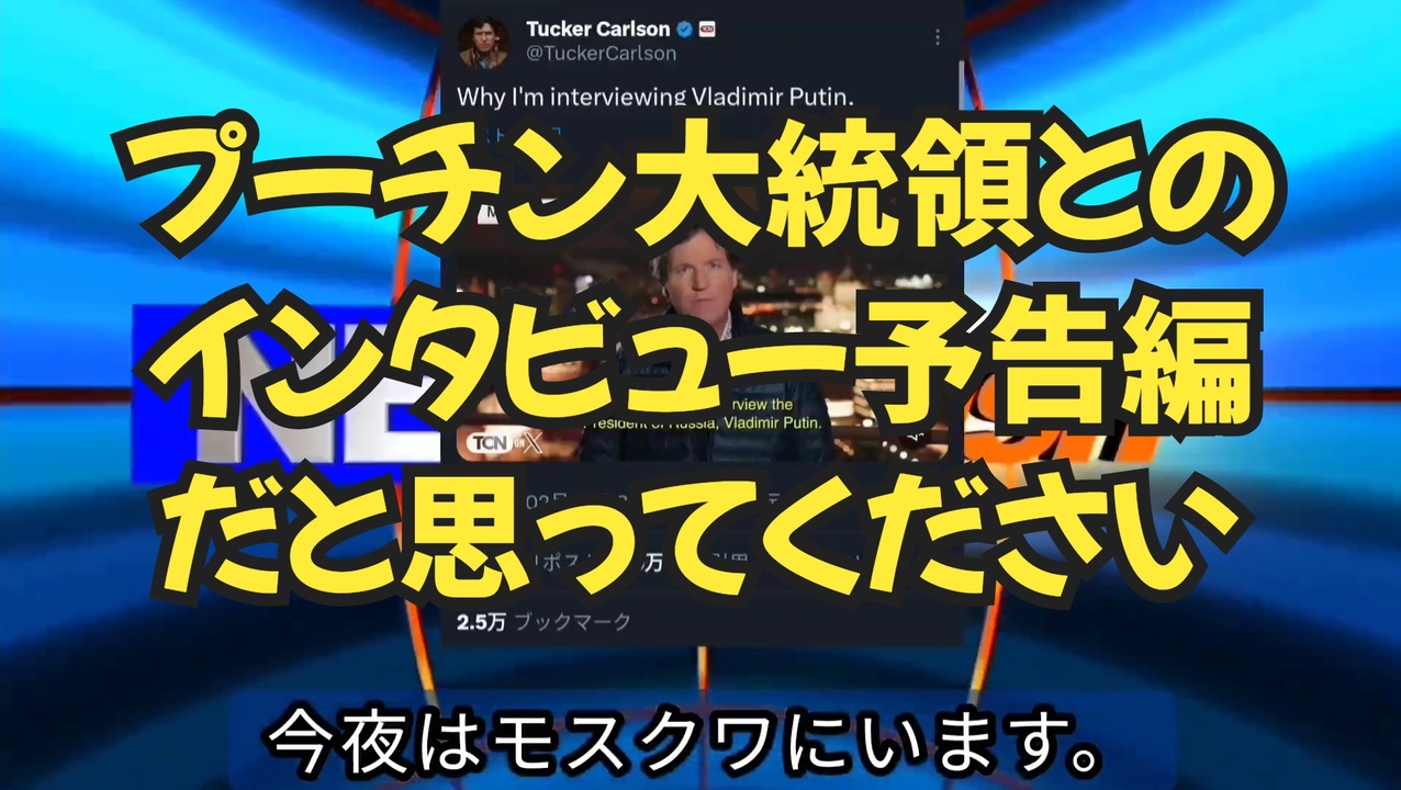 タッカー・カールソンさんのポストより<br>ウラジーミル・プーチンにインタビューする理由<br><br>※タッカーさんの動画を文字起こしして翻訳しています<br><br><br><br>ウラジーミル・プーチンは、ロシアの大統領にインタビューするためモスクワにいる。<br><br>今夜はモスクワにいるが世界の形を変えつつある戦争が始まって二年になるが、ほとんどのアメリカ人は何も知らされていない。<br><br>600マイル離れたウクライナで何が起きているのか本当のところは知らない。<br><br>彼らはまだ十分に理解していないかもしれないが、代償の多くを支払っている。誰も真実を伝えていないからメディアは堕落していると考えている。<br><br>彼らは読者や視聴者にウソをついている。例えば、ウクライナでの戦争が始まった日以来、米メディアはウクライナのゼレンスキー大統領に何度もインタビュー。<br><br>アメリカが東欧での戦争に深く入り、代償を払うという要求を増幅させるため。<br><br>ウラジーミル・プーチン大統領にインタビューしようとしなかった欧米のジャーナリスト。<br><br>自分たちが巻き込まれている戦争について知りうる限りのことを知る権利がある。<br><br><br><br>Why I'm interviewing Vladimir Putin.<br>プーチンにインタビューする理由<br> <a href="https://t.co/hqvXUZqvHX" target="_blank" rel="noopener nofollow">https://t.co/hqvXUZqvHX</a><br><br><br><br>タッカー・カールソン<br>X<br>ロシア<br>メディア<br>真実<br>プロパガンダ<br>政府<br>プーチン大統領<br>インタビュー<br>妨害工作<br>NSA<br>西側諸国<br>西側メディア<br>ウクライナ戦争<br>ゼレンスキー<br>ウクライナ支援<br>偏向報道<br>デマ<br>陰謀論<br>親ウクライナ<br>反ロシア<br>腐敗<br>嘘<br>欺瞞<br>ジャーナリスト<br>グローバリスト<br>バイデン政権<br>アメリカ<br>モスクワ<br><br><br>日本語字幕が苦手な人向け<br>日本語吹き替え風<br><br />著作権、肖像権に配慮して作成しております。<br><br>◆気になったニュースの台本!?<br>メモ代わりに作った台本をそのままあげてます<br><a href="https://keiichiro8140.hatenablog.com/." target="_blank" rel="noopener nofollow">https://keiichiro8140.hatenablog.com/.</a><br><br><br>ここからはシリーズ紹介<br><br><br>◆ ワクチン解毒・デトックス<br><a href="https://x.gd/fZweg" target="_blank" rel="noopener nofollow">https://x.gd/fZweg</a><br><br>◆ウイリアム・マキス博士のがん治療(イベルメクチン・フェンベンダゾール等)<br><a href="https://x.gd/AtFYS" target="_blank" rel="noopener nofollow">https://x.gd/AtFYS</a><br><br>◆予防接種健康被害救済制度<br><a href="https://x.gd/0xK9x" target="_blank" rel="noopener nofollow">https://x.gd/0xK9x</a><br><br>◆気になったニュース #1501~<br><br>◆ 【ショートver】気になったニュース<br><a href="https://x.gd/7MxXC" target="_blank" rel="noopener nofollow">https://x.gd/7MxXC</a><br><br>◆ 気になったニュース #1001~<br><a href="https://x.gd/Lp8gv" target="_blank" rel="noopener nofollow">https://x.gd/Lp8gv</a><br><br>◆ 気になったニュース #501~<br><a href="https://x.gd/EmbS4" target="_blank" rel="noopener nofollow">https://x.gd/EmbS4</a><br><br>◆ 気になったニュース #1~#500<br><a href="https://x.gd/uPhNb" target="_blank" rel="noopener nofollow">https://x.gd/uPhNb</a><br><br>◆ X(旧Twitter)・テレグラムで気になった情報<br><a href="https://x.gd/YG6FT" target="_blank" rel="noopener nofollow">https://x.gd/YG6FT</a><br><br>◆ 日比谷5万人パレードデ⚪生放送アーカイブ動画<br><a href="https://x.gd/3CHJv" target="_blank" rel="noopener nofollow">https://x.gd/3CHJv</a><br><br>◆日比谷5万人パレード⚪モのマイリスト作ってみました<br><a href="https://nico.ms/mylist/76828848?ref=sp_other" target="_blank" rel="noopener nofollow">https://nico.ms/mylist/76828848?ref=sp_other</a><br><br>◆3.30 令和の百姓⚪⚪<br><a href="https://www.nicovideo.jp/series/511791?ref=garage_share_other" target="_blank" rel="noopener nofollow">https://www.nicovideo.jp/series/511791?ref=garage_share_other</a><br><br>◆ 及川幸久さんの【XNEWS】シリーズ<br><a href="https://x.gd/3k78K" target="_blank" rel="noopener nofollow">https://x.gd/3k78K</a><br><br>◆これまでの動画<a href="https://x.gd/sPXoJ" target="_blank" rel="noopener nofollow">https://x.gd/sPXoJ</a><br><br>◆もしも(BAN)の時のためのマイリンク集<a href="https://lit.link/K-16_News44" target="_blank" rel="noopener nofollow">https://lit.link/K-16_News44</a><br><br>