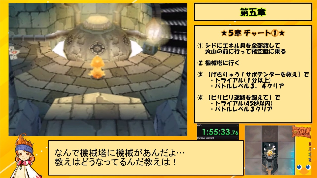 ラストが近づいてきたPart6<br>最後のクリスタルはワッカが発狂しそうな場所にあった…<br><br>5章開始~光のクリスタル前まで<br><br>お詫び…<br>編集ミスでPart3の終盤からタイマーが30秒ほど<br>遅くなってます センセンシャル…<br><br>前:<a href="https://www.nicovideo.jp/watch/sm43346462" class="watch">sm43346462</a><br>次:<a href="https://www.nicovideo.jp/watch/sm43388475" class="watch">sm43388475</a><br><br>総集編:<a href="https://youtu.be/-QvFHQ-RklI" target="_blank" rel="noopener nofollow">https://youtu.be/-QvFHQ-RklI</a><br>ほぼ無編集版:<a href="https://youtu.be/4nFiGocf2Dg" target="_blank" rel="noopener nofollow">https://youtu.be/4nFiGocf2Dg</a><br><br>使用ハード:3DS LL (偽トロ)<br>タイマースタート:ストーリーモードを選択した時<br>タイマーストップ:ED直前の暗転した時<br><br><br><a target="_blank" href="https://qa.nicovideo.jp/faq/show/19424?site_domain=default" style="font-size: 13px;color: #657586; text-decoration: underline; line-height: 1.4">この動画は投稿者によって修正されました</a>
