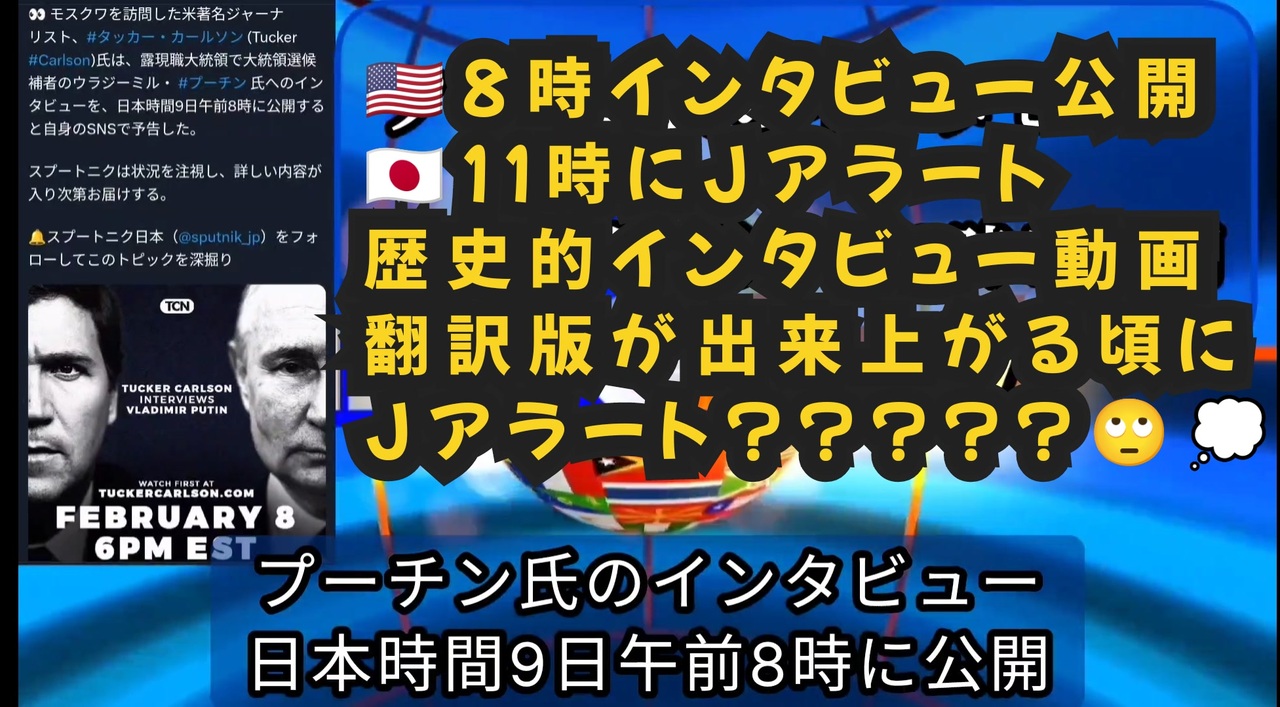 プーチン氏のインタビュー、日本時間9日午前8時に公開<br>モスクワを訪問した米著名ジャーナリスト、タッカー・カールソン氏は、露現職大統領で大統領選候補者のウラジーミル・プーチン氏へのインタビューを、日本時間9日午前8時に公開すると自身のSNSで予告した<br><a href="https://x.gd/5VSGI" target="_blank" rel="noopener nofollow">https://x.gd/5VSGI</a><br><br><br>Xはタッカー・カールソンが同プラットフォームでロシア大統領にインタビューした事を確認した直後、米国で最も利用されたアプリとなりました<br><br>AppfiguresによるとXは11万7000件の新規ダウンロードを記録した<br><a href="https://x.gd/qdoMU" target="_blank" rel="noopener nofollow">https://x.gd/qdoMU</a><br><br><br>ロシアのペスコフ報道官<br>「2月6日にタッカー・カールソンがプーチン大統領にインタビューをしたが、ネット上に公開されたプーチンとカールソンのインタビュー原稿とされるものについてはフェイクだ」<br><a href="https://x.gd/La4kG" target="_blank" rel="noopener nofollow">https://x.gd/La4kG</a><br><br><br>プーチン大統領とタッカー・カールソンとのインタビューは米国に予想以上の反応を起こした<br>このインタビューはアメリカ社会にとって情報爆弾になるだろうと元米軍情報将校のスコット・リッターは語った<br><a href="https://x.gd/wTSOv" target="_blank" rel="noopener nofollow">https://x.gd/wTSOv</a><br><br><br>タッカーは長年にわたる親ウクライナプロパガンダの台本をひっくり返そうとしており、フェイクニュースメディアはすでにかんしゃくを起こしている<br><a href="https://t.co/k39DGvuhNv" target="_blank" rel="noopener nofollow">https://t.co/k39DGvuhNv</a><br><br><br>Jアラート<br>2月9日11:00<br>全国一斉情報伝達試験<br><a href="https://t.co/Sr0bs8uL5E" target="_blank" rel="noopener nofollow">https://t.co/Sr0bs8uL5E</a><br><br><br>イスラエルの『Kan News』による新たな調査で、10月7日のノヴァ音楽祭のハマスの残虐行為を証言した数十人のイスラエル人は、ノヴァ音楽祭に参加しておらず、数万シェケル(100万円程度)をもらって捏造証言していたと判明<br><a href="https://x.gd/vOK18" target="_blank" rel="noopener nofollow">https://x.gd/vOK18</a><br><br><br>メディアによれば、超健康な看護師の女性は、病院での仕事のためにワクチンを打たされたら歩けなくなり、働けなくなった<br><br>国が把握しているだけでも、このような後遺症を抱えた1万人を超える数の人々が薬害の救済の申請を求めている<br><a href="https://x.gd/dZBQv" target="_blank" rel="noopener nofollow">https://x.gd/dZBQv</a><br><br><br>2024.2.6鹿先生<br>2月5日ワクチン分科会で決まったことは、コロナワクチンが全てのワクチンと同時接種可能になった<br><a href="https://x.gd/7q419" target="_blank" rel="noopener nofollow">https://x.gd/7q419</a><br><br><br><br><br />著作権、肖像権に配慮して作成しております。<br><br>◆気になったニュースの台本!?<br>メモ代わりに作った台本をそのままあげてます<br><a href="https://keiichiro8140.hatenablog.com/." target="_blank" rel="noopener nofollow">https://keiichiro8140.hatenablog.com/.</a><br><br><br>ここからはシリーズ紹介<br><br><br>◆ ワクチン解毒・デトックス<br><a href="https://x.gd/fZweg" target="_blank" rel="noopener nofollow">https://x.gd/fZweg</a><br><br>◆ウイリアム・マキス博士のがん治療(イベルメクチン・フェンベンダゾール等)<br><a href="https://x.gd/AtFYS" target="_blank" rel="noopener nofollow">https://x.gd/AtFYS</a><br><br>◆予防接種健康被害救済制度<br><a href="https://x.gd/0xK9x" target="_blank" rel="noopener nofollow">https://x.gd/0xK9x</a><br><br>◆気になったニュース #1501~<br><br>◆ 【ショートver】気になったニュース<br><a href="https://x.gd/7MxXC" target="_blank" rel="noopener nofollow">https://x.gd/7MxXC</a><br><br>◆ 気になったニュース #1001~<br><a href="https://x.gd/Lp8gv" target="_blank" rel="noopener nofollow">https://x.gd/Lp8gv</a><br><br>◆ 気になったニュース #501~<br><a href="https://x.gd/EmbS4" target="_blank" rel="noopener nofollow">https://x.gd/EmbS4</a><br><br>◆ 気になったニュース #1~#500<br><a href="https://x.gd/uPhNb" target="_blank" rel="noopener nofollow">https://x.gd/uPhNb</a><br><br>◆ X(旧Twitter)・テレグラムで気になった情報<br><a href="https://x.gd/YG6FT" target="_blank" rel="noopener nofollow">https://x.gd/YG6FT</a><br><br>◆ 日比谷5万人パレードデ⚪生放送アーカイブ動画<br><a href="https://x.gd/3CHJv" target="_blank" rel="noopener nofollow">https://x.gd/3CHJv</a><br><br>◆日比谷5万人パレード⚪モのマイリスト作ってみました<br><a href="https://nico.ms/mylist/76828848?ref=sp_other" target="_blank" rel="noopener nofollow">https://nico.ms/mylist/76828848?ref=sp_other</a><br><br>◆3.30 令和の百姓⚪⚪<br><a href="https://www.nicovideo.jp/series/511791?ref=garage_share_other" target="_blank" rel="noopener nofollow">https://www.nicovideo.jp/series/511791?ref=garage_share_other</a><br><br>◆ 及川幸久さんの【XNEWS】シリーズ<br><a href="https://x.gd/3k78K" target="_blank" rel="noopener nofollow">https://x.gd/3k78K</a><br><br>◆これまでの動画<a href="https://x.gd/sPXoJ" target="_blank" rel="noopener nofollow">https://x.gd/sPXoJ</a><br><br>◆もしも(BAN)の時のためのマイリンク集<a href="https://lit.link/K-16_News44" target="_blank" rel="noopener nofollow">https://lit.link/K-16_News44</a><br><br>